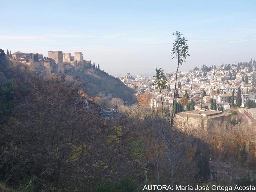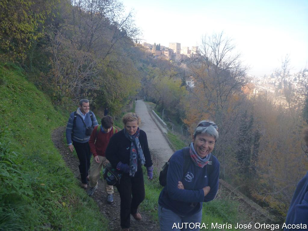 Volvimos sobre nuestros pasos para coger la primera vereda del camino, que nos elevó hasta la Acequia Real, por una umbría que no nos permitía quitarnos ninguna capa de abrigo a pesar de lo empinado del terreno. La vista del valle del Darro desde cada curva incitaba al descanso y a admirar nuestra ciudad y el valle aún frondoso lleno de árboles de hojas amarillas, que no se resisten a caer en este otoño que no quiere acabar.