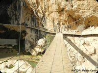 Empezamos el camino por el rio Velillos que lleva aceptable caudal de agua a pesar de las escasas lluvias. La vegetación sin embargo está algo mustia y seca. Pasamos por el primer puente y llegamos a una primera fuente de agua fresca que nos promete Buena Ventura según indica su nombre. Vamos ascendiendo por la vereda al lado del rio y pronto nos encontramos en el puente colgante y los tajos del Gollizno con su espectacular pasarela.