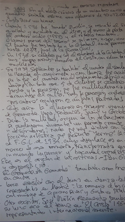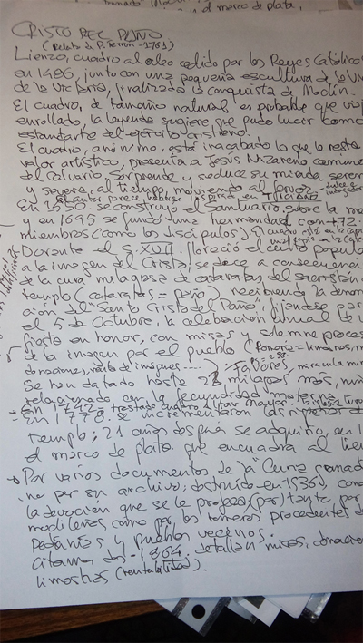 Ya en Moclín nos dirigimos en primer lugar a La Iglesia del Cristo del Paño, por fin Pablo nos cuenta todo lo que sabe, que no es poco, sobre la Iglesia, os paso sus apuntes a puño y letra,mejor que contaros todo lo que aprendimos