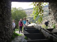 Iniciamos el paseo en Pampaneira, pronto llegamos a su Iglesia, de La Santa Cruz se llama, construida sobre la antigua Mezquita. Nos la encontramos abierta y todos nos vimos sorprendidos por su estupendo altar mayor del siglo XVIII y su artesonado mudéjar muy bien conservado. Seguimos subiendo por sus empinadas calles y mirando hacia abajo y atrás nos encandilamos con los terraos de launa que brillan con los rayos del sol que entresalen de las nubes mañaneras. Pronto encontramos la vereda que nos conduce hasta Bubión y vamos pasando por bancales con árboles frutales y moreras que en un tiempo abastecieron el mercado granadino de La Alcaicería y que dieron esplendor a La Alpujarra durante siglos. Algunos descansillos bajo los castaños y nogales nos permiten contar historias y leer trocitos de historia.