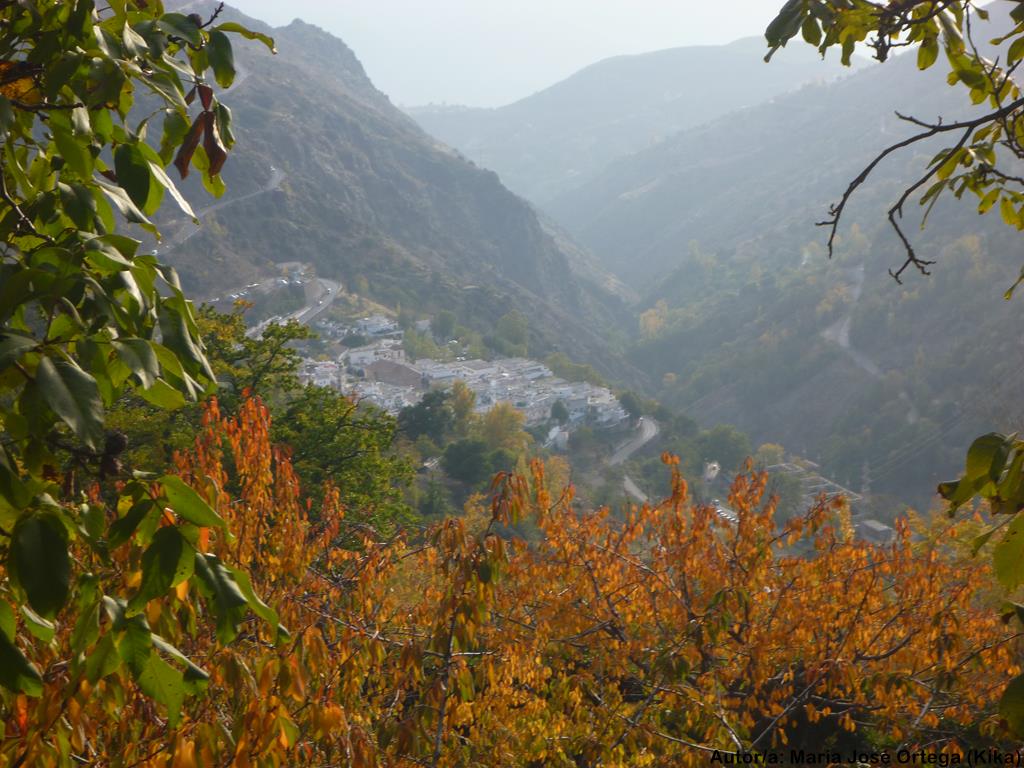 Dejamos Capileira buscando el Puente de Chíscar, que cruza el rio Poqueira que se acaba de formar unos metros más arriba, en la zona llamada La Cebadilla, al unirse las aguas del rio Naute (formado a su vez por el rio Veleta y Mulhacén) y el Rio Puntal. Aquí el camino asciende de nuevo y nos sitúa enfrente de los pueblos del Poqueira que aparecen ante nosotros de forma progresiva, iluminados por el sol de la tarde.