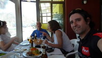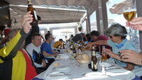 ¿Y quién estaba en el chiringuito?. Los cuatro presuntos paduleños. Y decimos presuntos, porque no hubo manera de confirmar que efectivamente venían todo el camino por delante de nosotros, pues la única prueba que aportaban era... ¡ja; el número de jarras de cerveza bebidas hasta el momento de nuestra llegada!. El menú estuvo incluso mejor que otros años. Lo que no bajó de nivel, fué en el copeteo de remate; ¡cómo sería la cosa que alguno acabó llamándose a sí mismo con un teléfono en cada oreja!.