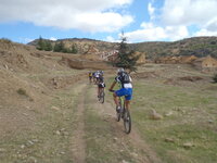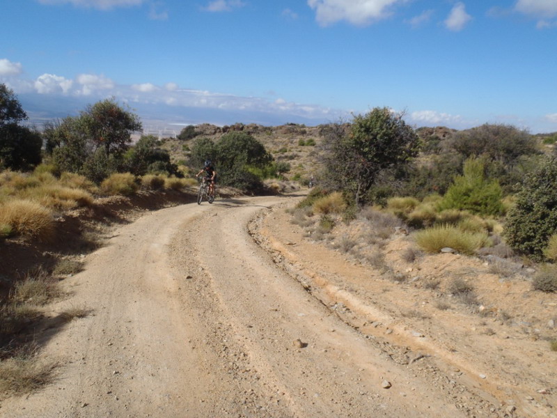 El terrero de tierra compacta, con viñas a los lados y grandes molinos de viento que harían las delicias del Quijote y Sancho fue lo siguiente pasando por varias cortijadas como los Miguelones y otras. El terreno era un sube y baja con llanos bordeando las laderas hasta llegar a una bifurcación donde se empina algo para seguir hasta la aldea de la Rambla del Agua, con su típica iglesia que otro día visitaremos. Hasta aquí, con su vuelta siguiendo el carril de la izquierda al llegar al pueblo, era el itinerario previsto y conocido por el organizador. Como el grupo deseaba más trayecto, nos dirigimos siguiendo por la pista, con alguna que otra subida fuerte, hacia El Raposo.