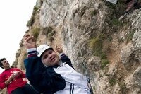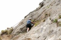 El sitio elegido por Fernando resultó un acierto, con un pie de vía ancho y cómodo, cubierto de hierba. Mientras los "escaladores" montábamos las cuatro vías, nuestros amigos de Homo Sapiens jugaban al balón para hacer tiempo. Que no les hacía falta trepar demasiado para sentirse importantes se vio con lo ilusionados que se sentían simplemente poniéndose el arnés y el casco. Como se trataba de una actividad de inclusión, y de que todos disfrutáramos y nos sintiéramos iguales, escaló todo el que quiso, incluidos familiares y monitores, y el que quiso repitió. Lo de menos era llegar arriba. Con unos pocos metros ya se oían los gritos de triunfo y los aplausos de ánimo. Lo más difícil era convencerlos de que la cuerda los sujetaba para bajar... esto también le costó a algún adulto. Una vez abajo todos nos colmaban de abrazos, elogios y aplausos. Nosotros nos sentíamos plenamente recompensados a cambio de dar muy poquito. Así que animo a todos a que colaboren en este tipo de actividades, porque no hay nadie más agradecido que estas personas cuando las ayudas, y pocas cosas le hacen sentir a uno mismo mejor. Nada más. Solamente dar las gracias a todos los que participaron, al Club Mulhacen por facilitar la actividad y a Homo Sapiens por brindarnos un rato tan bueno. Espero que lo repitamos pronto. Ellos están siempre abiertos a este tipo de colaboraciones.