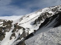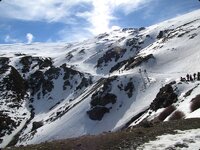 Será a partir de los 2600/2700 m cuando la nieve se vuelve hielo y la prudencia aconseja poner cuchillas o directamente crampones. Cada uno optó por la técnica que consideró mas oportuna. Evolucionar por esta zona nos hacía pensar en el riesgo de tantos compañeros pero entre todos conseguimos llegar a la cumbre sin excesivos problemas y disfrutando de ese "no sé qué" que te infunde la dificultad de llegar a la cumbre.