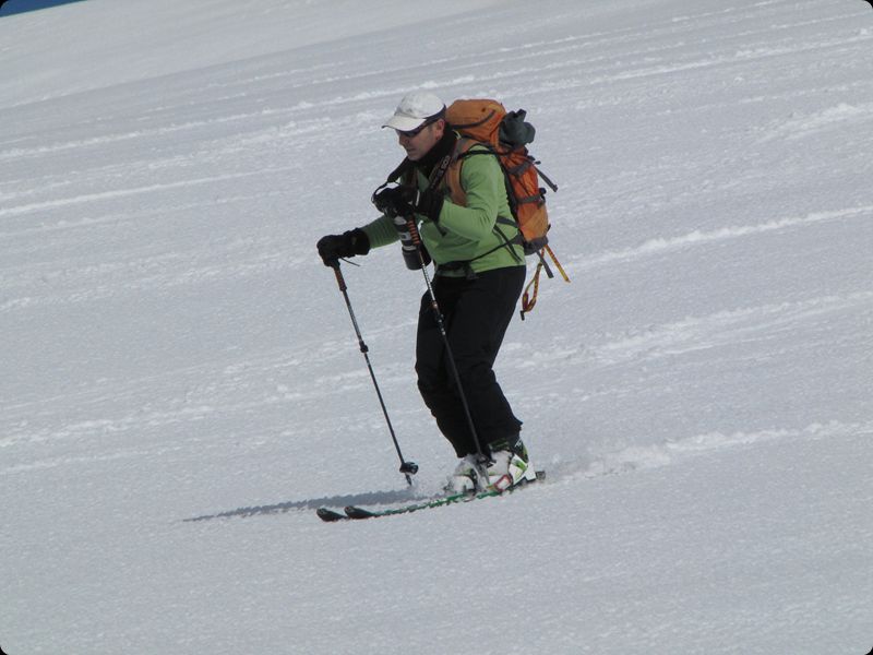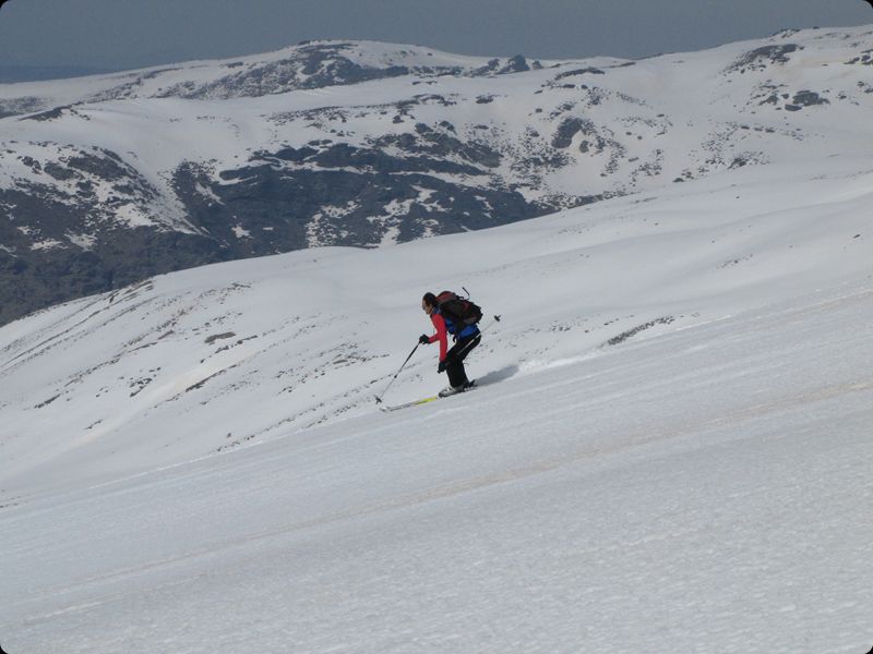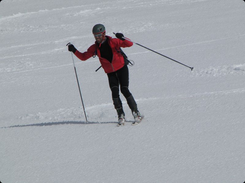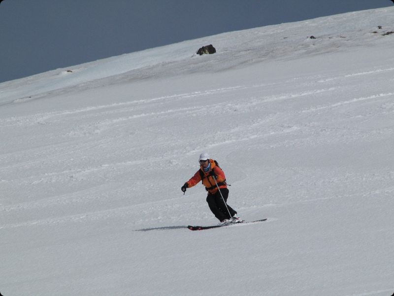 Primero algunas dudas de si se podía o no bajar esquiando, después por imitación a los mas decididos nos vamos animando todos y con los esquíes puestos, comenzamos la bajada con un poquito de vibración por el duro hielo. Vamos perdiendo altura y el hielo pasa a ser una excelente nieve para practicar el esquí en tan atractiva zona. Mi poca capacidad literaria impide que os transmita lo que sentimos en esta memorable bajada por las faldas del Caballo.