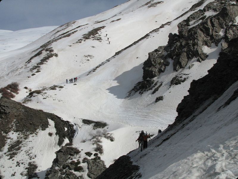 Empezamos a progresar por el carril que busca el Barranco del Caballo y a pocos metros ya tenemos la primera nieve y unas sensaciones sobre la misma muy buenas. Atravesamos sin dificultad la parte mas pendiente del mismo y nos encontramos con una subida franca hacia la cumbre con nieve dura pero que se dejaba tratar.