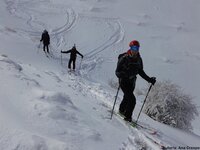 Subimos primero por las pistas de fondo para coger un pequeño valle y encaramarnos al Morrón Sanjuanero por el SE, al abrigo del viento que pegaba un poco. Bajamos por su cara norte, en una nieve polvo tan excelente que volvimos a subir otra vez para hacer un canuto paralelo al primero. Finalmente ponemos las pieles una tercera vez para subir al collado que nos permitirá bajar hacía La Ragua.