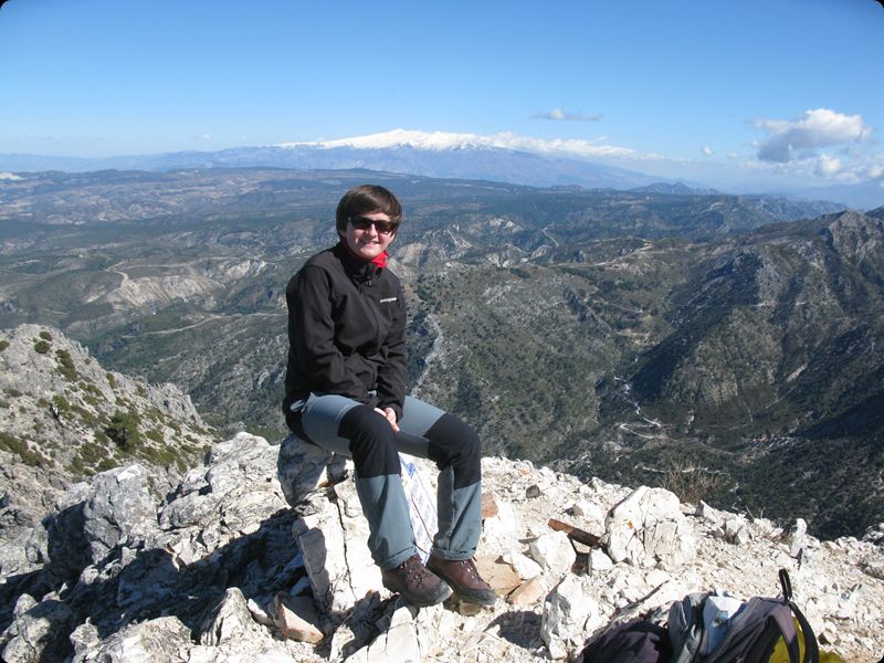 El último tramo del camino, totalmente empedrado y serpenteante, llenó a todos (o por lo menos a mí) de alegría por la llegada a la cima. Y otra vez: ¡Qué bonito! Al sur el mar, Nerja, Frigiliana; al norte, Sierra Nevada y al Oeste la Maroma. Se ven muchos senderos que invitan a más. El sol brilló y el bocadillo estaba más rico que normalmente. Jesús trajo un vino de los buenos (¡un palo cortado de 20 años!) y Ana una tableta de Lindt Excellence (hmmmmmm!). También hubo una ronda de tortillas variadas, todas deliciosas. ¿Qué más se necesita para ser feliz? (Bueno, a lo mejor llegar a casa después...).