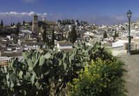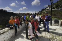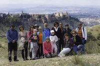 Llegamos hasta la Cruz de la Rauda, donde nos hicimos la primera foto de familia (hoy el fotógrafo es Luis Ordoñez) para desde allí subir por los empinados senderos de las cuevas de San Miguel. Durante la subida asistimos a una pelea verbal entre dos "morenitos" aunque la sangre no llego al río. También nos salió al paso un hippy a explicarnos no se qué en un español chapurreado que apenas entendimos, y poco más arriba, ahora sí, una chica en español nos invito a unos talleres y un concierto que se iba a celebrar sobre las 12 según dijo. Ya veremos, le dijimos y seguimos hacia arriba pasando por las cuevas (nuevamente abiertas por los hippies y que el Ayuntamiento las había cerrado hace una semana) y llegando hasta el mirador de de San Miguel Alto, no sin antes admirar el huerto de primor que tienen los hippies junto a la segunda muralla del Albaicin conocida como la cerca de Don Gonzalo.