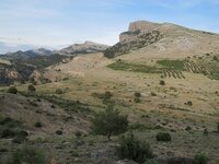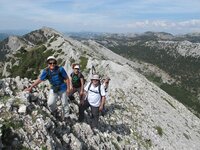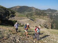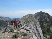 Ya arriba, de tú a tú con el espectacular vuelo de las enormes rapaces reinas de estos cielos, la tropa mulhacenera comenzó a extasiarse con las vistas de las alturas y a jugar con los nombres de los hitos que surgían a nuestra vista: "¿aquel que despunta? el Empanadas, qué va, ese es el Banderillas!, entonces , detrás estará el Yelmo, no?" Justo en frente el Cabañas y ya en progresión lineal, la cuerda de los Agrios, el Picón del Guante (1934mts) y el Rayal (1832mts). Poco a poco, en entusiasta avanzada, andando sobre brotes de bella y nívea roca caliza, fuimos conquistando almena tras almena hasta que por fin, ya cuando los rayos de sol eran poco más que caricias, divisamos abajo en la lejanía, nuestros coches con Kika, su guardesa.