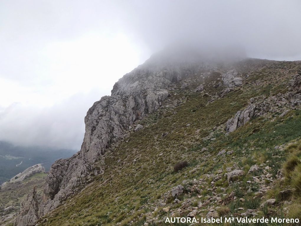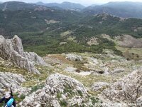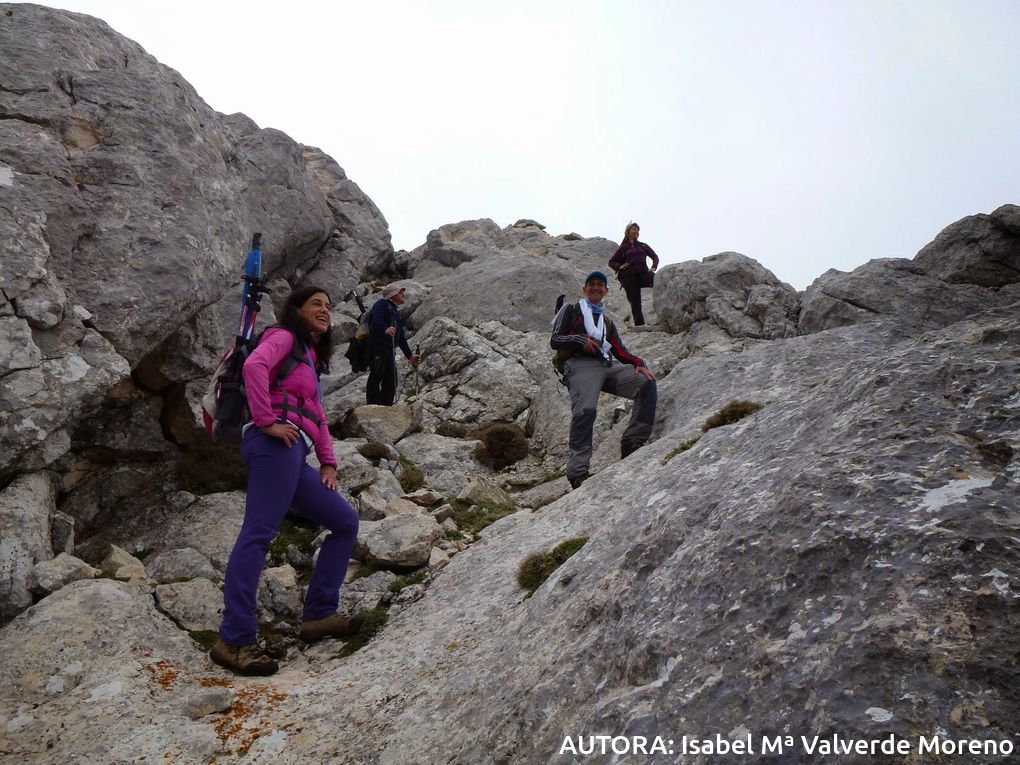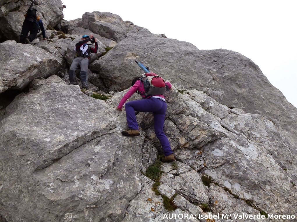 Pues con esta confianza, situados en la falda del macizo calizo, comenzamos a trepar conducidos con maestría por Miguel, que hace bueno el refrán que dice que " es más cierto médico el experimentado que el letrado", por un "colador" ( mejor que "sumidero") que nos encarama rápidamente cerca del Peñon de la Higuera (1547m).