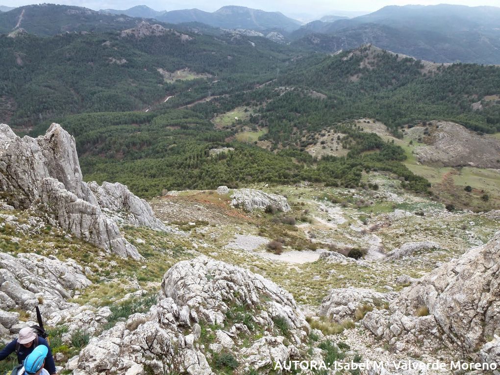 Es un buen mirador natural hacia el valle del Arroyo Bermejo, en el centro el Cortijo de Carialfaquí. Hacia el Sur: Orduña; hacia el Norte: Sierra Nevada, tapada por las grises nubes. Continuamos, pues nuestro propósito es "hacer cima" en el Majalijar(1861), la mayor altura del pequeño mazizo. Asi que, tras las fotos de rigor, miramos a nuestra derecha e iniciamos el "cresteo", la coreografía que mejor ejecuta Miguel y Ana interpreta con presteza. Visitamos el Peñon del Jorobado(1554m) y seguidamente, tras emocionante trepada "vertical" el hermoso Calar de Haza Santa y sus peculiares "dolinas". Por último, finalizamos este entretenido paseo en la cima del Majalijar, de 1861m. En este punto, después de las fotos de recuerdo , Ana propone una parada técnica para comer algo. Pero, don Día da por finalizada la tregua concedida como confirman unas gráciles vacas "moruchas" que burlonas abandonan raudas el paraje.