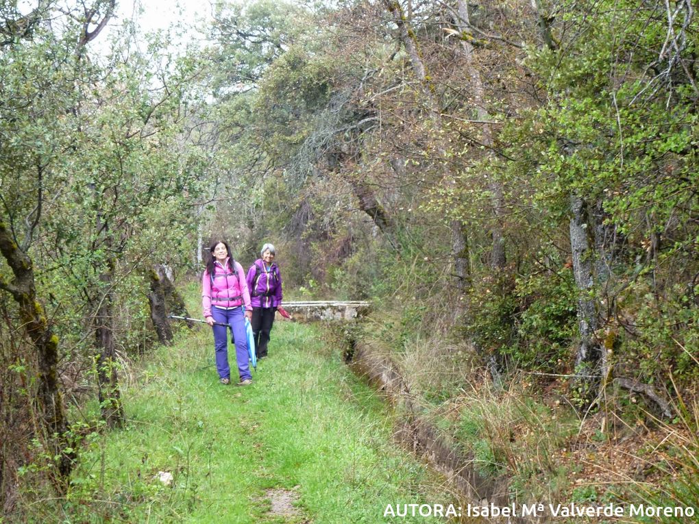 La espesa niebla que ya tapa el valle sube veloz y precipitadamente, nos expulsa del paraíso feraz, empujándonos hacia el Peñón de la Era(1628m), aunque antes de llegar a éste bajamos campo a través, paraguas abiertos, al encuentro de una fuente-abrevadero sita ya en la senda tradicional de ascenso al pico. Transitamos por la vereda entre un tupido encinar, que en su parte inferior atraviesa algunos aclarados del monte, antiguos campos de cereales y patatas hoy abandonados. Un poco más abajo, interceptamos la conocida Acequia del Fardes, sin agua, semiderruida en algún tramo, sin la utilidad y esplendor que mostraba hasta no hace tanto. Giramos hacia la derecha y la seguimos durante media hora larga hasta que dividamos el vehículo.