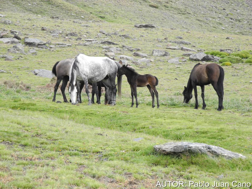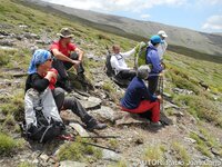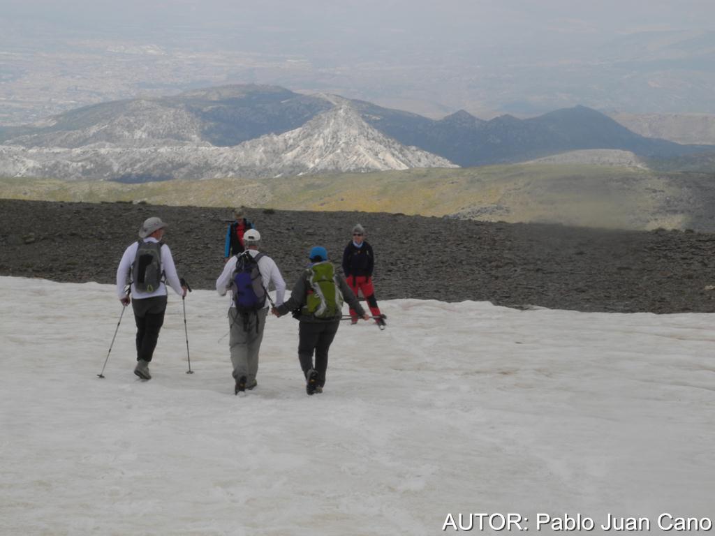 Mientras descendemos hacia los Tajos Altos, Antonio Morell hace cima y se une al grupo. Bajamos al encuentro de Los Nacimientos atravesando varios neveros que satisfacen el "mono" de los esquiadores. Los borreguiles lucen un frescor intenso tapizados de preciosas flores y musgos, parecen milagrosos surcos de vida en medio del "desértico" canchal.