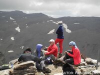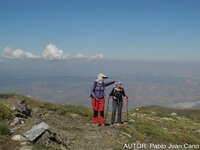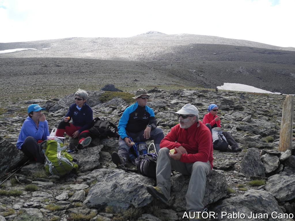 En dos horas y media hacemos cima felices y contentos, pero una horda de giris ingleses "toma" el Cerro. Nos centramos en la ceremonia de la comida, y elevamos al altar la tortilla de Antonia, allí, mejor que la de Cam Roca.