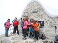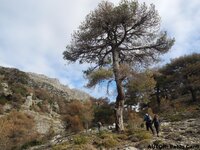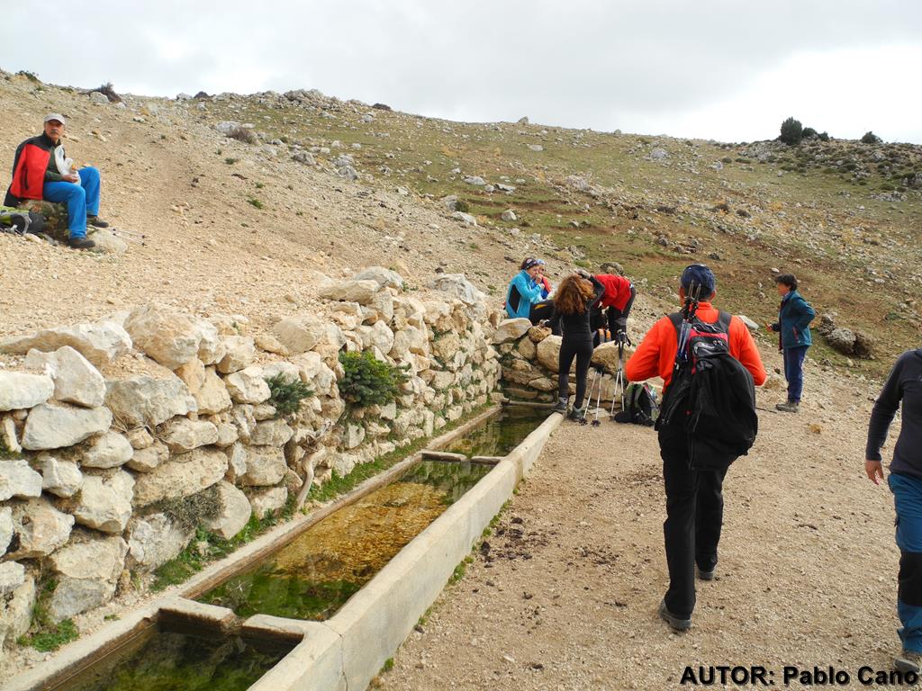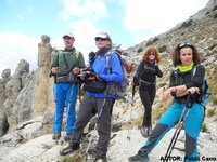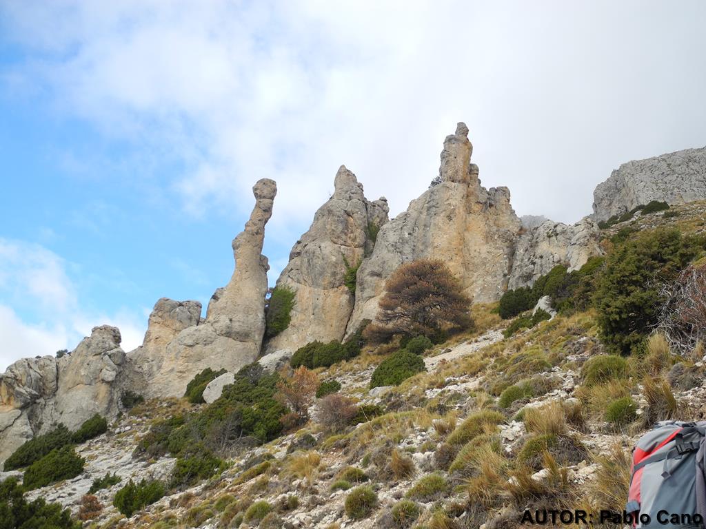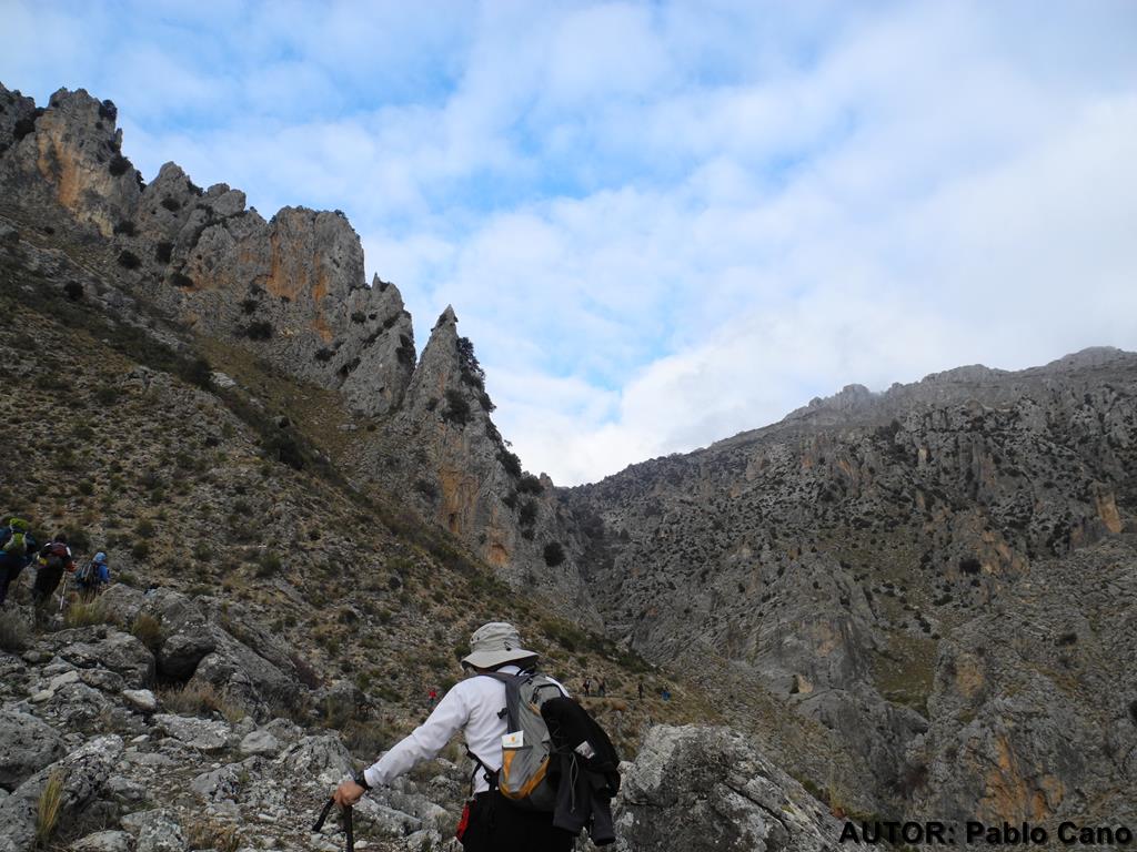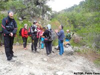 Llegados a Iznalloz, tomamos, a la izquierda una carretera comarcal pintoresca, que atraviesa, sucesivamente, Píñar ; con su castillo cimero y su prehistórica “Cueva de las Ventanas”, Torre- Cardela, y, ya en la provincia de Jaén, Guadahortuna. El atractivo de sus campos de cereal y olivo, que verdea alguna huerta de cuando en cuando, distrae nuestra atención hasta que aparecen las estribaciones del macizo de Mágina, donde cambia el paisaje. Sobrepasados los cruces de Huelma y su pedanía “la Cabrita”, tomamos un carril terrero - ¡ en” pésimo” estado!- que, tras cuatro kilómetros, nos sitúa frente a un puente sobre el río Gargantón. A la izquierda, señalado con un poste comienza el sendero. Atravesamos un breve pinar, para adentrarnos en el “feroz” barranco del río, cruzando el cauce en tres ocasiones. Al cabo de un kilómetro y medio, arribamos al popular paraje del nacimiento, que merece el comentario de Ramón y algunas fotos. Allí mismo, una acequia “ladrona”, que sale por el margen derecho, regala el agua a Bélmez de la Moraleda. Vadeamos el río, y seguimos el sendero, algo desdibujado, aunque marcado con hitos de piedra, que serpea y toma altura por este margen izquierdo, hasta que llegamos a la “Puerta del Gargantón”. La senda se estrecha, flanqueada por las crestas de “Los Bolos” ,y un contrafuerte rocoso, que cae extraplomo sobre el cauce del río. El panorama “sobrecoge”, porque el barranquito del riachuelo se ha transformado en un escenario “sobrenatural”, que bien parece una descomunal boca de tiburón o cola de dinosaurio dispuesta a castigar a osados dioses menores. El grotesco espectáculo lo completa el cimero collar de góticos pináculos de amenazante belleza. Agotadas baterías de cámaras y móviles, - ¡ y la paciencia de algunos!- reanudamos la marcha, que avivan, con su sexta velocidad, Mariló, Carlos y Manolo. Alcanzamos de nuevo el cauce del río, seco, y cruzamos al margen derecho, comenzando la subida por el paraje de “ Las Lisas”, una costra rocosa donde la senda ha sido destruida por la erosión, y que guarda algunos pasos complicados. Los salvamos, sin problemas, bajo el vigilante magisterio de Ramón. Tomados como referencia dos laricios “abanderados” que asoman en la loma, nos dirigimos, y al poco entramos en el hermoso pinar autóctono “pinus nigra” ( también “salgareño”) con algunos ejemplares centenarios. Disfrutamos del singular atractivo del lugar, pero, observamos impotentes y preocupados, como, tanto individuos adultos como jóvenes han sufrido el azote de una virulenta plaga de procesionaria. Por fortuna, los pinos de la ladera de la “Cuerda de los Milagros” permanecen impolutos. La senda gira ahora a la derecha por el “barranco del Cervato” dibujándose las crestas de “ Las Morras del Pollo de Mágina ( 2067m)” y “Peña Jaén (2014m)” por encima del pinar. Tras 25 minutos, accedemos al collado encantado de la“Cueva de los los Lobos” (1585m) que presiden, formando una pictórica estampa “romántica”, varios hermosos “centinelas”, que alzándose de entre las rocas, se recortan sobre el fondo celeste. Después de la obligada sesión fotográfica, subimos una rampa terrosa que nos encarama a una fuente – abrevadero, en el paraje de las “Fuentezuelas”, idóneo para hacer un alto que reponga fuerzas. Descansamos durante 25 minutos, bromeando sobre la extraña “flojera” que “trae” algún ilustre mulhacenero, víctima probable de juerga nocturna. Reanudada la marcha, algunos nos sumamos al grupo cabecero, que hoy comandan con solvente suficiencia Manolo, Mariló y Carlos. Transitan la senda, que en exigente zig- zag, asciende en diagonal por el flanco izquierdo de las “Morras del Pollo de Mágina”(2067m) y que nos llevará a la falda de la cuerda de los 2000m, en cuya cima se encuentra nuestra meta: el refugio “Miramundos”(2077m). Antes, sin embargo, llegamos a las “Chimeneas de las Hadas” , formación pétrea “antropormórfica” en equilibrio imposible, donde nos detenemos para reagruparnos; una excusa perfecta para tomar testimonio fotográfico. Proseguimos. Por encima de las “Hadas” (1800m) desaparece el pinar, sustituido por el característico piornal “¡almohadillado!”, entreverados de sabinas y enebros rastreros. Un instante imagino el lugar cubierto de nieve; precioso, o , perlado de flores, en primavera. Contrasta sobremanera, con el “cálido” otoño que sufrimos. ¡De pronto ¡, sobre la próxima Cuerda, asoma, un momento, el tejado del Refugio, por lo que acometemos este último tramo de ascenso, ya campo a través -¡ y en línea recta!- con ánimo renovado. Al cabo de unos 25 minutos, los del primer grupo accedemos satisfechos al “Refugio Miramundos”(2077m) enclavado estratégicamente en lugar de privilegio, que permite disfrutar de inmejorables vistas de 360º sobre las sierras de Jaén y Granada, semiocultas hoy por las nubes que las visitan. Cuando llegan el resto de los “expedicionarios”, el desapacible “fresco” nos empuja al interior del refugio, recién rehabilitado y muy limpio,¡ pero sin mobiliario!. Oficiamos el almuerzo merecido, y en la breve sobremesa, chocolates “gourmets” y turrones navideños convocan el espíritu de las “fiestas”, que conduce Kika cantando villancicos, que los demás secundan. Mara aprovecha la ocasión para invitarnos a una gala de su coro la próxima semana. Finalizada la sobremesa, nos preparamos para regresar por el mismo camino, desandando lo ascendido, pero, Carlos, Mariló y Manolo ofrecen un itinerario mejor, -¡ y además inédito!- que aceptamos encantados. Salimos abrigados, tomando un sendero, que, partiendo del mismo refugio, desciende suavemente entre el modelado kárstico de simas y profundas dolinas de la depresión de la “Hoya de los Tejos”. Obviamos la senda que asciende al pico Mágina, entrando en un vallado que abandonaremos p