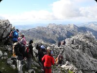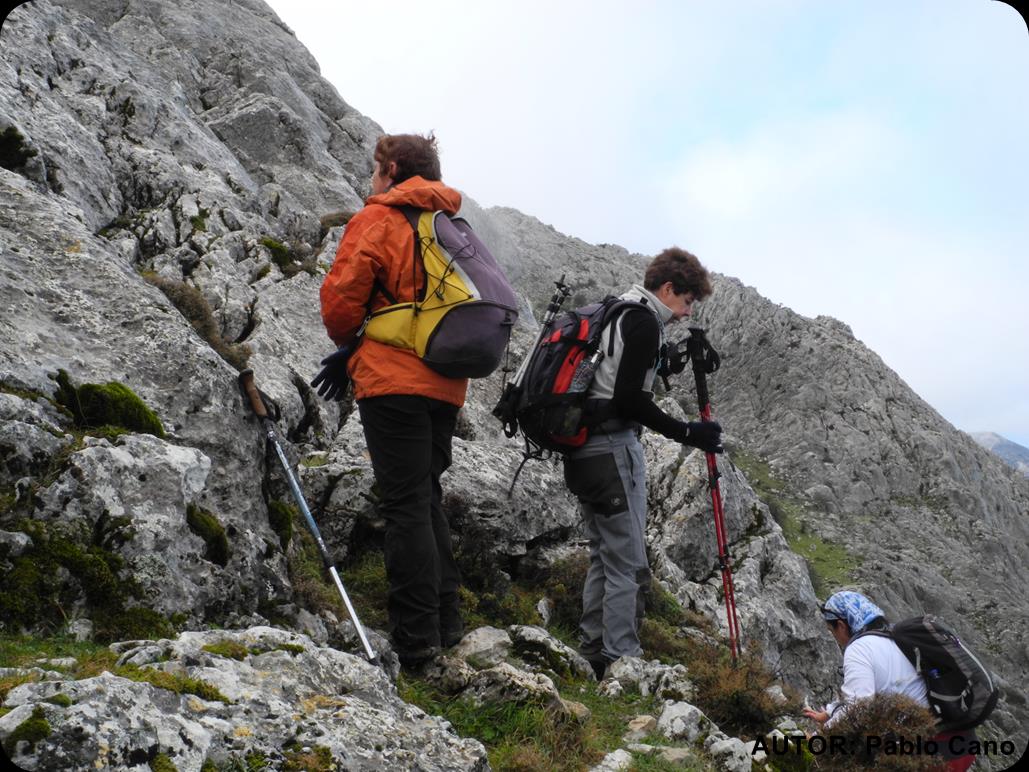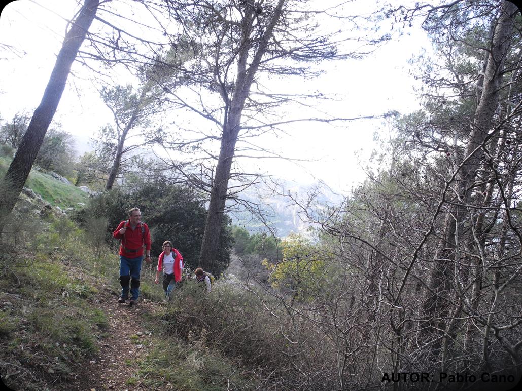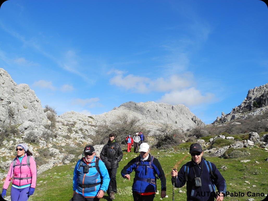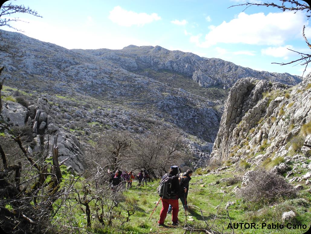 El lugar parece una ilustración de cuento fantástico, tomado por el feroz invierno, mientras en el olivar campero y el otro extremo de la sierra, tamizados por una luz especial, se ha instalado un día espléndido. El escenario infunde respeto, porque ante nosotros se alza, imponente y oscuro, un grisáceo murallón calizo, que ceñido por la niebla presenta un aspecto sobrecogedor. Los de la zona lo llaman “ el derrumbaero”...Pero los mulhaceneros no nos arredramos ante “impertinencias meteorológicas”¿ Alguien lo dudaba?, y, en consecuencia, aunque no en las condiciones soñadas, iniciamos la marcha de ascenso, entre brumas, por una empinada senda, a tramos embarrada, que discurre junto a un vallado. Animan la cabeza “los Ordoñez” liderados por Guillermo – en su “primera juventud”- y Paco Bédmar. Tras algo más de media hora, llegamos a un estratégico collado en el flanco izquierdo, con vistas tanto a Villanueva del Rosario como a la Venta de Alfarnate y Axarquía, semiocultas. El día quiere cambiar a nuestro favor, por lo que, ya reagrupados, saludamos esperanzados las primeras ráfagas de aire fresco, que nos empuja a seguir subiendo,- ahora, y entre la niebla-, por una húmeda costra caliza. Nos encarama ésta, a una breve repisa resguardada, poblada de majuelos, donde hacemos una parada “técnica” para beber algo, y dar cuenta de frutos secos y turrones navideños. Con el ánimo intacto, pese a las inclemencias, continuamos subiendo, accediendo enseguida a la primera antecima rocosa de crestas que anteceden al pico. Ya no hay vuelta atrás. Comenzamos aquí, la segunda parte de la excursión –especialidad mulhacenera- que consiste en “surfear” cual arriesgados funambulistas por un mar de afiladas rocas, que juegan con nuestro equilibrio, concentración y paciencia. “Los Ordoñez” protegidos por la alfombra de Aladino, o alguna nave de videojuego, “vuelan” sobre la rocalla, Ana y Paco Bédmar “danzan” con las manos en los bolsillos. Por contra, los menos dotados, con pies y manos “reptamos” por la roca traidora. Tras más de media hora circulando por la cuerda, nos encontramos frente a El Chamizo . Cuando la cabeza corona el pico entre la espesa niebla, los de la cola iniciamos la trepada final, sucediendo que, llegados nosotros a la cima, se obra el ansiado “milagro”, y barrida por el viento aliado, la niebla pertinaz abandona la cumbre. Hasta aquí hemos empleado algo menos de tres horas. Por fin disfrutamos, desde esta atalaya, de la excepcional belleza panorámica que esperábamos. A Ana, en su esencia, se le agolpan los ¡Ohhhh!. Los demás, a coro, la seguimos con más ¡ohhhh!; seducidos. Abajo “topografiamos” con la vista los pueblos más cercanos a la montaña: Alfarnate y su “venta de Alfarnate” (desde la que se accede también a El Chamizo). Alfarnatejo, con su “Sierra de En medio” y “El Navazo”, que adosa el singular “Tajo de Gomer”-¡no sé cuantas fotos le hice!-. Riogordo y Colmenar, también están muy próximos. Si levantamos un poco la vista, el pantano de La Viñuela espejea, y, como una flecha, nos señala el horizonte, donde aparece el Mar Mediterráneo. Si seguimos desplazando la vista, de derecha a izquierda avistamos los Montes de Málaga, el Torcal de Antequera, La Sierra de las Cabras... Y girándonos 180º grados la sierra de Loja, Zafarraya y Sierra Tejeda con su habitual montera....por citar algunos. Aun con la emoción embargada, abandonamos la cima por una preciosa senda, marcada con hitos. Ésta, va girando en dirección sur (izquierda), y, además, recreando la vista con nuevas imágenes de la Axarquía, entretiene la bajada hasta el “Puerto de los Perdigones(1401mts)”. Apeados por fin del castillo de rocas y girando hacia la derecha, vamos entrando en un paraje conocido como “el torcal”, formado por “idílicas” praderas de montaña (navas) “adornadas” de “cojines” y majuelos, protegidos por caprichosos centinelas pétreos. El lugar “respira”, parece un paraíso soñado. El día sonríe al fin. En resumen, que habiendo salido indemnes del peligroso “cresteo” matutino, merecemos un descanso. Nos detenemos en un espacio de ensueño que parece preparado para oficiar el apetecible almuerzo. Al fondo, cerrando el valle, sobresale El Chamizo (cara oeste), mientras, nosotros, los comensales, disfrutamos en “cómodos” asientos e improvisadas “butacas” en el centro del prado. Todos celebramos los chistes de Miguel y la “endiablada retórica” de Guillermo... Pero haciendo buena la sentencia de “lo bueno si breve...”la tranquilidad y el sosiego duran “un suspiro”, porque, cuando por fin saco mis viandas (- ¡pesao! ¿ quieres dejar ya de hacer fotos?), los demás están dando fin al chocolate suizo (francés), y, Guillermo y Luis,¡ que ni siquiera se han sentado!, ya quieren “levantar” a la tropa. Reanudamos felices la marcha, decidiendo regresar definitivamente, y dejando pendientes la visita al pico de la Cruz(1440mts) y Peña Negra. Ahora, finalizada la “pradera”, entramos en un valle lateral, que van estrechando las caprichosas “torcas”, y, que se abre al valle central, poco después de atravesar la puerta de un vallado. En éste, y girando a la derecha, tomamos la vereda “Camino de Riogordo” que baja al carril de acceso al Alto de Hondonero a la altura del Peñon de los Becerros(1100mts). Transitamos, poniendo cierta atención en el suelo húmedo, por esta vereda preciosa, que discurre entre majuelos, encinas, quejigos, algunos rodales de arces de Montpellier y algún almendro con la flor adelantada. Completan el cuadro, las paredes de roca, tapizadas de hiedra y el sotobosque espinoso cubierto de musgo. Continuando el descenso, y tras pasar por una peculiar fuente con tres vanos, llegamos a un cruce, en el que, a la derecha, aparece una senda poco transitada, que, convencidos por la guía, tomamos los rezagados. Los p