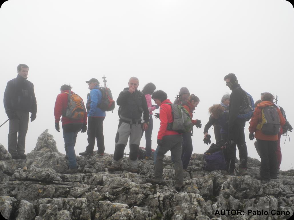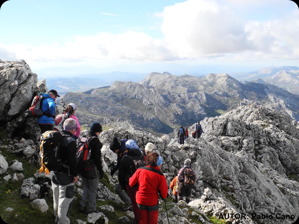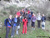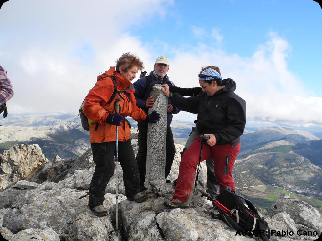 En Salinas, abandonamos esa vía, y tomamos la A-359 rumbo a las Pedrizas, que dejamos en la segunda salida tomando la A-6119, hacia Villanueva del Rosario. Nos reagrupamos, y siguiendo la indicación de “Dehesa de Hondonero” y la de “Mirador y Alto de Hondonero” subimos una pista durante 5’5 kms, obviando cruces a La Ermita de la Virgen del Rosario y observatorio de aves. Detenidos los cuatro vehículos, 19 mulhaceneros: Guillermo, Conchi, Pilar, Ramón, Miguel Parejo, Isa, Luis Ordoñez, Antonia, Elena, María, Luisillo, Ana presi, Carmen Car, Mª Ángeles, Paco Bédmar, Jesús, Mara, Kika y Pablo iniciamos la aproximación al pico desde el flanco izquierdo de la Sierra del Jobo, desde un collado al que nos ha conducido, entre brumas, una senda. Nos encaramamos a la cuerda e iniciamos el cresteo previo a la última trepada hasta la cumbre, señalada con vértice geodésico (1641m). Hasta aquí hemos empleado unas tres horas aproximadamente. La niebla se desvanece permitiendo disfrutar de un panorama espléndido desde esta singular cima. Abandonamos “El Chamizo” por una senda marcada con hitos, que nos conduce, en dirección sur (Axarquía frente a nosotros), hasta el Puerto de los Perdigones (1401mts). Girando a la derecha, entramos en “el torcal”, sucesión de praderas o navas, donde nos detenemos a almorzar. Reanudada la marcha, salimos desde un estrechamiento al valle principal de la Sierra de Camarolos, atravesando una puerta en un vallado. Interceptando la vereda “Camino de Riogordo”, bajamos al Alto de Hondonero. Para este segundo tramo de la jornada, hemos empleado otras tres horas, por lo que la duración de la excursión es de unas 6 horas en total, y un desnivel aproximado de 500mts. Finalizamos esta inolvidable “experiencia” merendando en “El Capricho” de Villanueva del Trabuco”.
