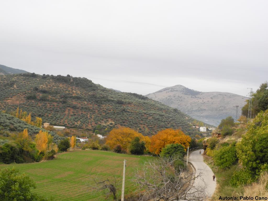 Accedemos al pueblo tras una hora larga de viaje, 85 kms y unas “curvillas” por el olivar infinito de Alcalá la Real y Castillo de Locubín. Valdepeñas nos recibe con los maravillosos colores otoñales que cromatizan álamos, nogales, caquis, membrillos o granados de su vega somera . La riega el Río de Susana, que recibe, respectivamente, los aportes del Arroyo del Vadillo, por la derecha, y del Arroyo de Ranera ( o Rancera (IGN) ) por la izquierda. Llegados por la “Carretera de Granada” al núcleo urbano, giramos a la derecha siguiendo la ribera del río, y, tras cruzar un puente sobre éste, aparcamos los vehículos junto al IES Sierra Sur. Comenzamos desde aquí la excursión sobre las 9’26, que Ana abre descubriéndonos el fantástico paraje de Las Chorreras. En un espacio de un kilómetro te sumerges en un mundo que el río ha labrado a su capricho, tomado por una abigarrada vegetacion. Los lugareños lo han acondicionado para su disfrute y del de que los visiten.