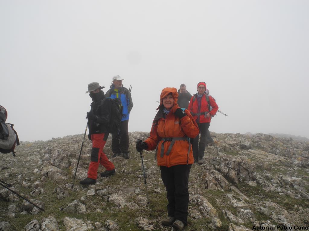 Cuando llevamos un buen rato de ascenso continuado, llegamos, a las 11’20, a la antecima, momento que Ana aprovecha para, sacando la bota ( que Mara ha traido de la Mancha) proponer la primera parada reponedora. Disfrutamos de las vistas por corto intervalo, porque, aunque aun se distingue con nitidez la silueta triangular de Valdepeñas, la densa niebla ya se ha apoderado de las sierras vecinas. Nosotros, sin árboles protectores, notamos más el frío, así que, la bota “viaja” varias rondas completas hasta que decidimos reemprender la marcha.