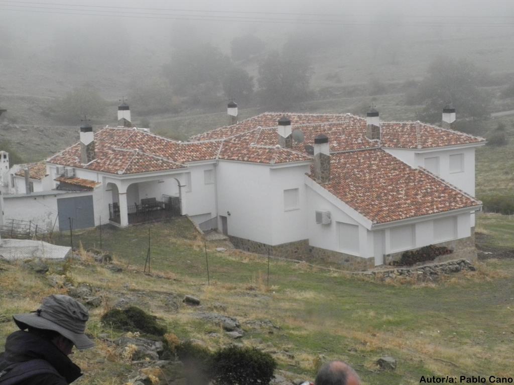 Sobre las 12’00 ya estamos encaramados en la ondulada cuerda pedregosa del macizo, donde abundan las simas y dolinas. Ana, mientas asegura con vehemencia que “navegamos” por el Mar de Tetis, trata de trazar un itinerario que nos permita avanzar en dirección norte- noreste. La niebla, sin embargo, dificulta incluso vislumbrar apenas los profundos barrancos que se van abriendo a derecha e izquierda, donde asoman, como fantasmales testigos, algunas encinas y solitarios arces. Hacia las 13’00, cuando ya hemos recorrido el primer tercio de la cuerda, una fina lluvia obliga a abrir los paragüas, y como consecuencia, Ana decide abandonar la cima e iniciar la vuelta, dado que nos “han birlado” las preciosas vistas que esperábamos comtemplar desde esta privilegiada atalaya. Tras la pertinente consulta al mapa, iniciamos un nuevo rumbo, que Ferrán controla con la brújula, de sentido inverso al anterior( ahora sur- sureste). Descendemos ¡muy ufanos! en línea “recta” por el intricado bosque de pinos y encinas por el que transitamos, hasta que ¡estábamos advertidos! Una alambrada de espino se interpone en nuestro camino. Como por inercia, y ¡algo atribulados! Vamos descendiendo junto al vallado, pero, algo cansados, nos hacemos permeables a los ruegos de Ramón, concediéndole el merecido alto para comer, que,¡ la verdad! todos deseábamos. La lluvia nos otorga una tregua,y el almuerzo trancurre distendido disfrutando con exquisiteces gastronómicas tales como carne de membrillo casera, quesos artesanos o salchichón de ciervo... entre tientos ¡ y más tientos! a la bota salvífica. Para los “postres”, surtido navideño de bombones, turrones y chocolates ¡suizos! ya hemos recuperado el humor y las fuerzas para reemprender la marcha. Seguimos,y diez minutos más tarde, como un milagroso holograma aparece la puerta que buscábamos, que cruzamos raudos,entrando en un encinar aclarado,que desciende hacia el Cortijo de las Ánimas, que se bosqueja, entre las brumas, en el fondo del valle.