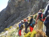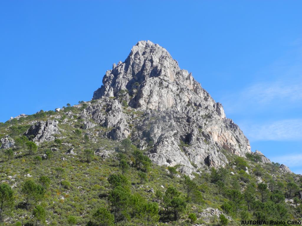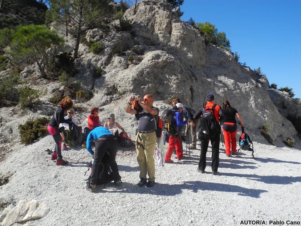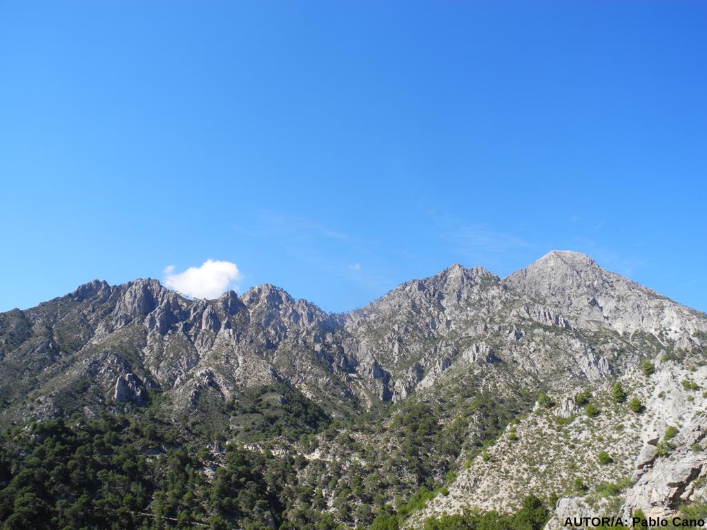 Como el lugar lo merece, y frente a nosotros se ierge enhiesto y aun lejano el Pico del Cisne o de Dos Hermanas (1484mts) paramos un breve lapso para “recuperar el fuelle”. Hacia el Mar el Cisne se prolonga en la Sierra de Enmedio, que flanqean El Cerro de los Monederos y más abajo el Fuerte, por donde baja embarrancado desde el Lucero el río Higuerón. En sus aguas someras y vivaces nos refrescamos después de reiniciada la marcha y descender a su encuentro por este “ Camino Real” que dibuja después, entre el rumor de los arroyos, varias curvas, hasta que lo abandonamos en el paraje de “el Carrascal”, junto a la balsa y el helipuerto del plan infoca. Allí, marcado con hitos de piedra, nace el empinadísimo sendero, que salvando 650 metros, nos conducirá a la cumbre del Cisne. Gracias a las amenas historias que va contando Mariló y el vivo diágogo, superamos ¡sin pena! una primera parte larga. Acaba ésta, en una pequeña meseta sobre el barranco del río Higuerón, con vistas al mar, frente a la afilada aguja del Cisne, donde nos reagrupamos. Hacia el oeste asoma La Maroma (2068mts), máxima altura del Parque, detrás del Colmenar de Camacho y Cresta de los Civiles, “acompañándonos” hacia el norte El Lucero. Abordamos, a continuación, el segundo tramo de ascenso, “escorándonos” hacia la izquierda, con objeto de alcanzar el Collado de Dos Hermanas, que hollamos un primer grupo sobre las dos. La cumbre nos espera a tan solo 25 minutos, pero, como el paraje se nos antoja ¡casi acogedor! , para almorzar, resguardados del furioso viento que azota la cúspide rocosa, ¡y con inmejorables vistas!, dejamos la cima para postre y sobremesa. Mariló nos va enseñando “sus” montañas preferidas destacándose hacia el este el Navachica (1831mts), el Almendrón (1513mts), o el Cielo (1508mts), más al norte la Cadena (1645mts) y hacia el oeste los citados Cresta de los Civiles y Colmenar de Camacho, perfilándose tras la Loma de Daire, La Maroma (2068mts).