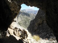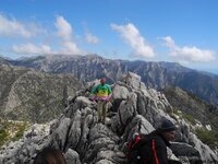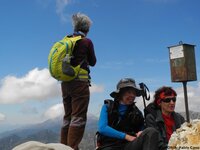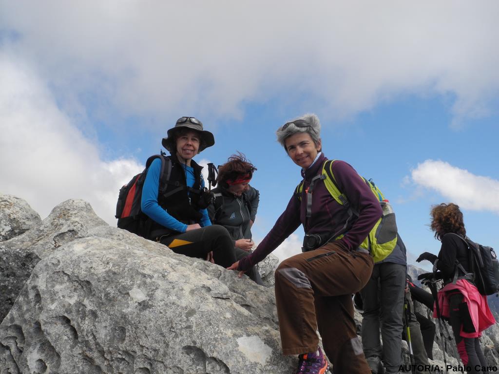 Tras el almuerzo atacamos la cima con bríos renovados, subiendo, primeramente, por una senda cabrera que acaba en un breve explanada, entre los dos picos más altos. Antes visitamos una cueva con increibles vistas, refugio de Maquis y pastores. A continuación, trepamos por un mar de rocas y pisamos ¡por fin¡la estrecha cima, sobre las tres de la tarde. Las panorámicas de la Axarquía Malagueña, con el horizonte del Mar Mediterráneo y sobre el descrito fondo de la sierra, compensan todo el esfuerzo realizado. Muy felices, dejamos nuestro saludo en el buzón montañero, instalado por el Grupo Senderista Manganillos de Vélez- Málaga, nos hacemos las últimas fotos de grupo y comenzamos el descenso sobre las 3'20 aproximadamente.