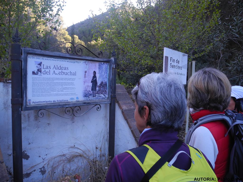 Reagrupados, tomamos un carril estrecho asfaltado, que pronto se convierte en pista terrera, que nos conduce a la aldea- poblado de El Acebuchal. Fundada en 1569, según datos históricos, por los moriscos huidos de la batalla de el Peñón de Frigiliana, sufrió varios abandonos en el siglo anterior; forzosa el del año 1946. En la actualidad, ha sido restaurada por nuevos y antiguos vecinos, luciendo como puerta de entrada al Parque Natural de las Sierras Tejeda, Almijara y Alhama (1999).