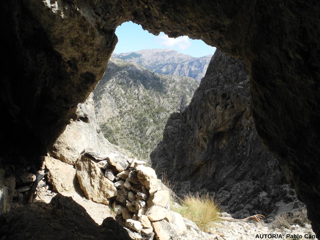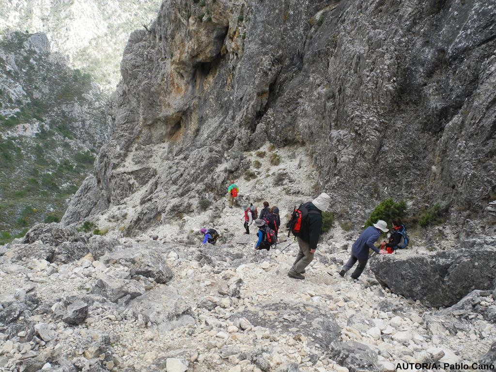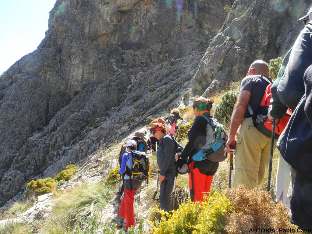 Interceptamos el camino por primera vez, nos “aligeramos” de ropa y seguimos subiendo por el escarpado sendero, que de nuevo alcanza la pista cerca de la Venta de Jaro o Cebollero. Frente al lienzo en pie, Mariló nos cuenta que esta venta, junto a otras, como la de Panaderos ( más cerca del puerto) dieron servicio a arrieros, labriegos, pastores, cabreros, resineros... desde el s.XVIII hasta la postguerra, cuando la inseguridad, provocada por los enfrentamientos entre los Maquis y la Guardia Civil, motivaron su cierre, y el abandono de esta tradicional vía de intercambio y comunicación entre la Costa Malagueña y Granada. Por el contrario, iniciativas como la de Mariló “reabren” el Camino Real de Granada, transitado hoy por senderistas. Proseguimos, y apenas 200 metros después, en una encrucijada de caminos, obviamos el de la izquierda ( hacia Cómpeta), tomando el de la derecha, que se transmuta en un sendero pino, que hacia las 11’55 nos encarama en el Collado Blanquillo; ventana incomparable ante un marco natural de fantasía alpina.