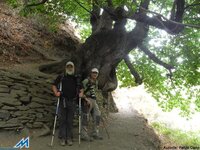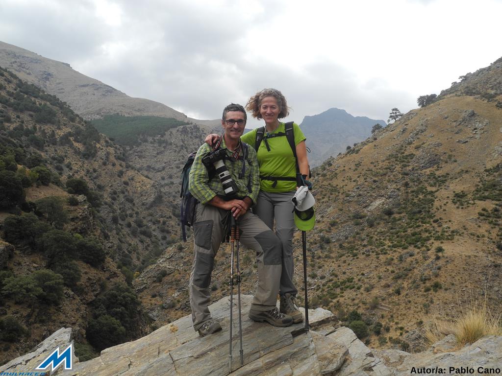 realizando al efecto una preciosa excursión al Cortijo del Hornillo (1870 mts), organizada por Ana. Salimos del “Serrallo” excepcionalmente ¡ a las 9’30! , rumbo a Güejar Sierra , siete mulhaceneros distribuidos en dos vehículos. Luís Ordoñez y Antonia son acompañados por Luís Fernández, amigo y fotógrafo aficcionado; mientras que con Ana viajamos Juan Carlos, Mara y el que escribe. Llegados al pantano sobrecoge su estado, hasta el extremo de que pareciera que del fondo fuera a emerger el antiguo pueblo de Canales. Proseguimos en vehículo hasta el mismo Barranco de San Juan, y aparcándolos en el paraje conocido como Vegeta del Caracol ( 1175 mts), iniciamos la marcha sobre las 10’30. Cruzamos el puente sobre el Genil y comenzamos a subir por la Vereda de la Estrella, mientras Mara, ¡afectada por el calor! entona un “amén” del Mesias de G.F.Haendel. Unos 10 minutos después, en una pronunciada curva, tomamos, a nuestra derecha, una empinada vereda que transita por un bosque aclarado de roble melojo, que sube hacia las casas de La Hortichuela, coincidiendo con el sendero Sulair (GR- 240). Son las 11’30, y vamos remontando la pista terrera en la que ha desembocado la senda, y que nos acerca a la entrada de la mina de serpentina abandonada, sita en esta extensa Dehesa de San Juan, finca privada antaño, hoy propiedad estatal, centradas las conversaciones bien en temas de fotografía, o en los ritos de paso de los adolescentes actuales; ¡botellones y borracheras!. Tomamos una senda, a la izquierda, que, primero, nos encarama a la zona alta de la vieja cantera, donde paramos brevemente para reagruparnos, y, remonta, a continuación, por un sugestivo bosque, en donde contrastan los tonos otoñales del robledal, con los oscuros de los cipreses de repoblacíon. Aproximadamente sobre las 12’15, llegamos a la explanada del Cortijo del Hoyo, en donde, entre varios grupos de peñas son visibles aun las ruinas de los viejos cortijos de la dehesa. Aquí, en sus labores se cultivaron la sin par “copo de nieve” o “papa de la sierra” ,-recuperadas hoy por el Parque-. Interesados pueden consultar en “la patata “copo de nieve” en www. Waste.ideal.es>sierranevada-patatas. Aquí nos detenemos, para disfrutar en este “mágico” paraje de nuestros frutos secos “gourmets” y otras exquisiteces ligeras. Reemprendemos la marcha, y, obviando la vereda que, a la derecha sube por Haza Mesa a la Morra (2206 mts), río San Juan y albergue de San Francisco, seguimos la senda, que entre preciosas panorámicas, primero, y el hermoso robledal después. cruza la cañada de Hervía y la Loma del Muerto y conduce a la Fuente Carmona (1705 mts), donde saciamos la sed que provoca esta calurosa jornada.