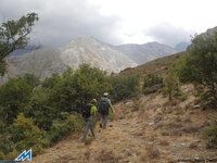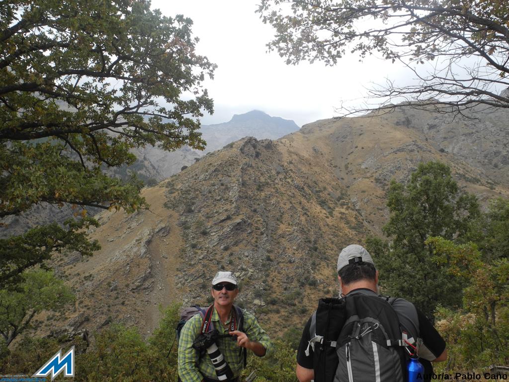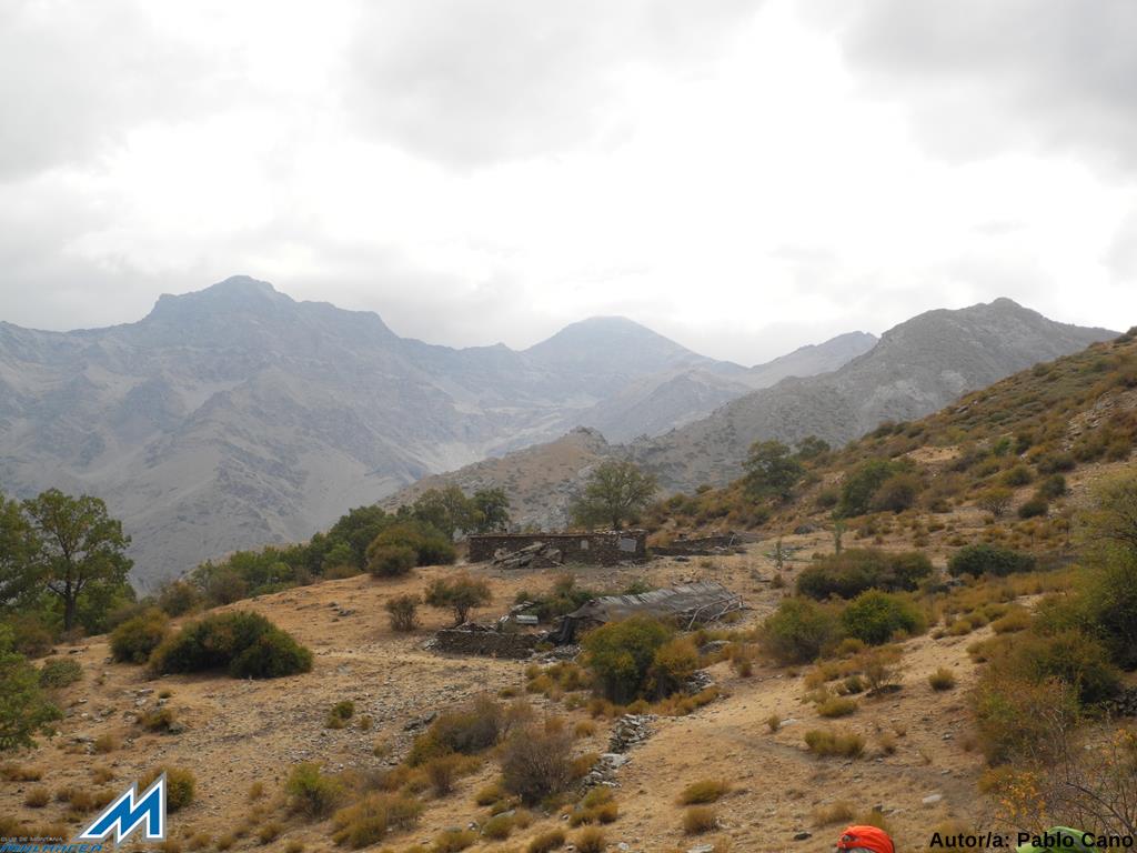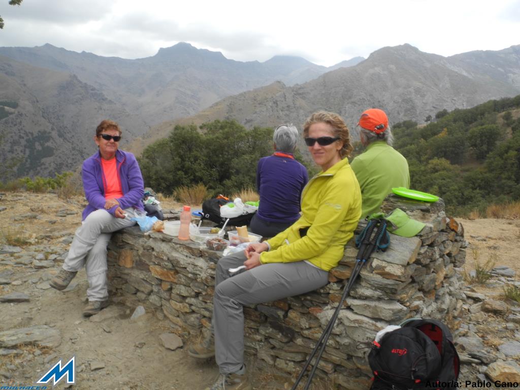 Nos ponemos en movimiento rápido y poco más adelante, tras pasar el arroyo de Cabañas Viejas, llegamos a un cruce de veredas. Tomamos el ramal superior, el de la derecha, ascendiendo por el robledal, enriquecido con arbustos de montaña, como espinos, rosales y mostajos; y flora diversa junto a los cursos de agua. Poco después, mientras avanzamos, el bosque deja entrever el mágnifico espectáculo de las cumbres del Parque: Mojón Alto, Puntal de Vacares, Alcazaba (3360 mts), Mulhacén (3482 mts), Juego de Bolos, Puntal de La Caldera…etc que, el mirador, que antecede a la explanada donde se sitúa el Cortijo del Hornillo (1870 mts), muestra íntrega. Una de las panorámicas más bellas de las cumbres de la sierra, sin duda. Hacia las 13’25, sobrepasamos las instalaciones del Hornillo, siguiendo la senda que acompaña a la acequia y nos dirigimos para almorzar a una fuente seca, situada bajo la “famosa” alberca, que cumple como comedor natural, con vistas de privilegio, eso si.