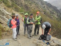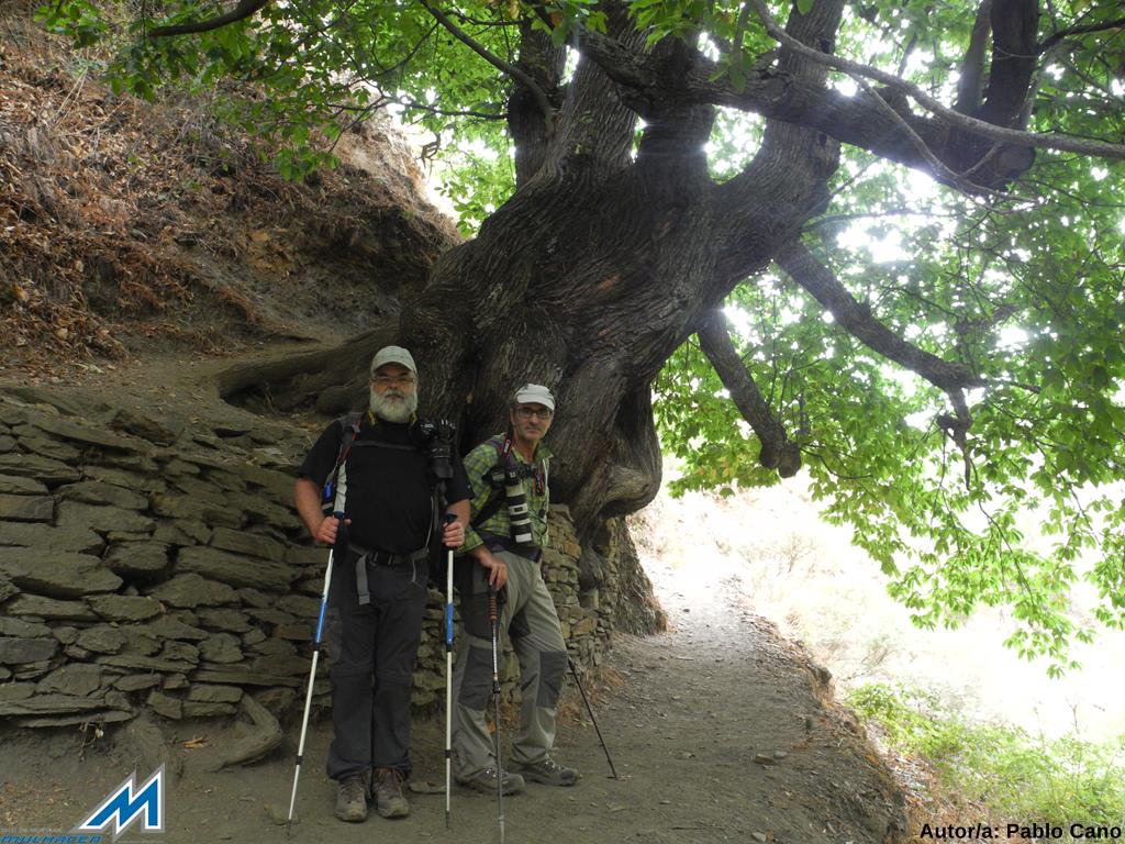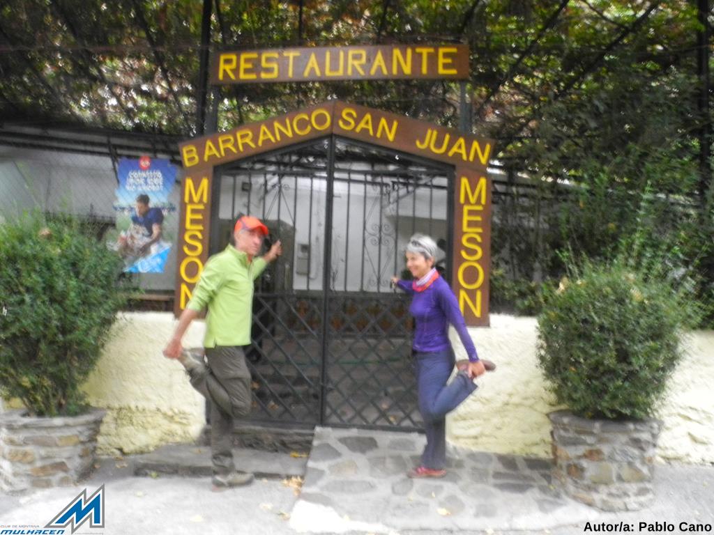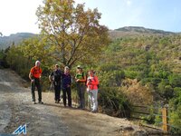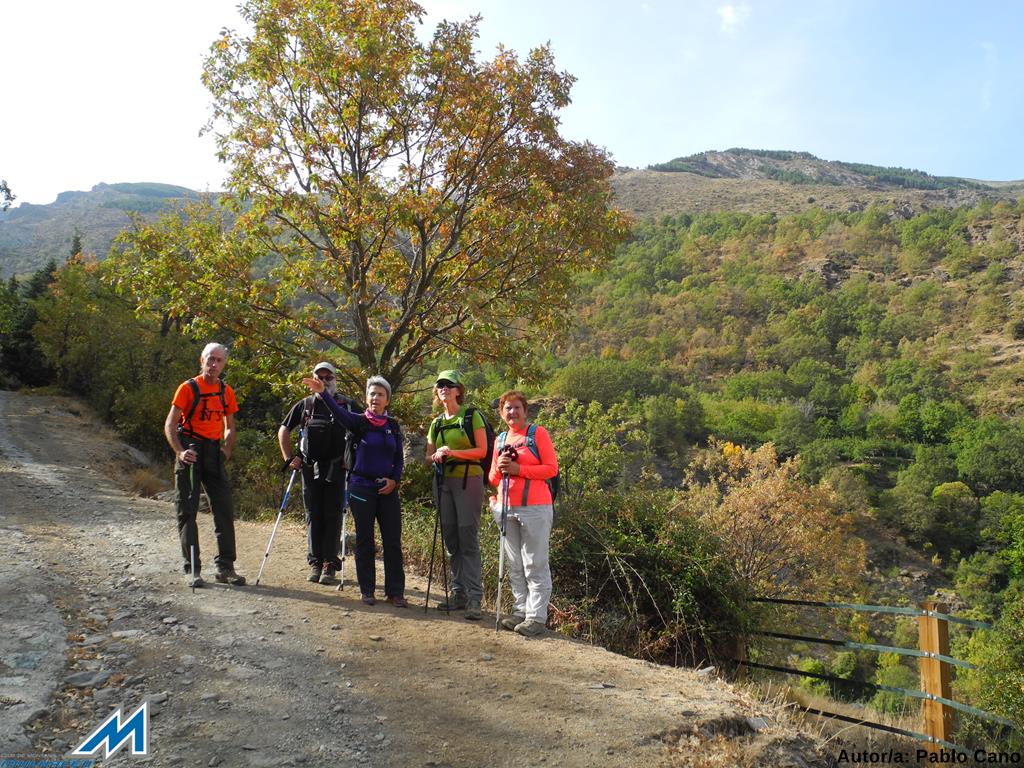 Ya todos juntos, nos hacemos unas instantáneas con fondo montañero, y, como son las 15’30 ¡Y todavía faltan 7 kms para el Barranco de San Juan!, Reeprendemos el regreso, que fotógrafos y “reportero” vamos retrasando ¡¡inevitablemente!!. Nos atan, las escenas otoñales que nos brindan alamedas, saucedas, fresnedas, arces, servales, cornicabras de las riberas del Genil o el viejo abuelo. Proseguimos, y tras obviar el cruce de la Hortichuela, descendemos hacia la Vegeta del Caracol, adonde llegamos sobre las 17’15, tras 16’3 kms y unas 5 horas “andando”, 7 totales y un desnivel de unos 700 metros. La cerveza, para celebrar “el inicio de curso” y aplacar la sed se demora hasta Cenes, donde, en una pizzería abierta, nos la sirven bien fría.