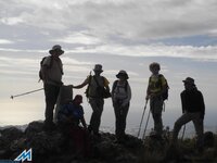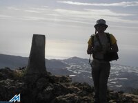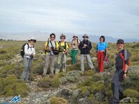 A continuación, con la moral ¡por las nubes!, terminamos de subir el frontal, entrando en una semiplanicie calcárea amesetada, donde varía la cobertura vegetal, rastrera y almohadillada, formada por “piornos” como el “cojín de monja o asiento de pastor” o el “piorno de crucecitas”, chaparros y algunos pinos silvestres “daleados” por la nieve y el viento. Vamos cruzando en ascenso la llanada de Los Pelaos, nevada, apunta Jesús, en la anterior visita, nos “inmortalizamos!, en el vértice geodésico, Lújar II (1810 mts), según el MTN25,1056-I, Vélez de Benaudalla, y, con rumbo noroeste nos dirigimos hacia “las antenas”de TV y el pico Pelaos (1844 mts), aunque, finalmente, a unos 200 mts de las susodichas, como ya son las 12’15, nos detenemos a almorzar.