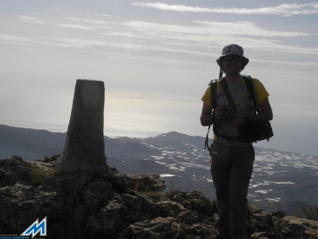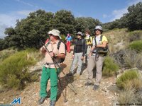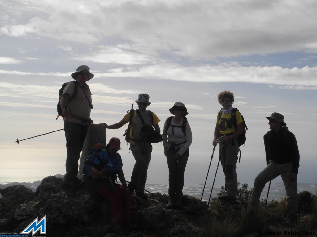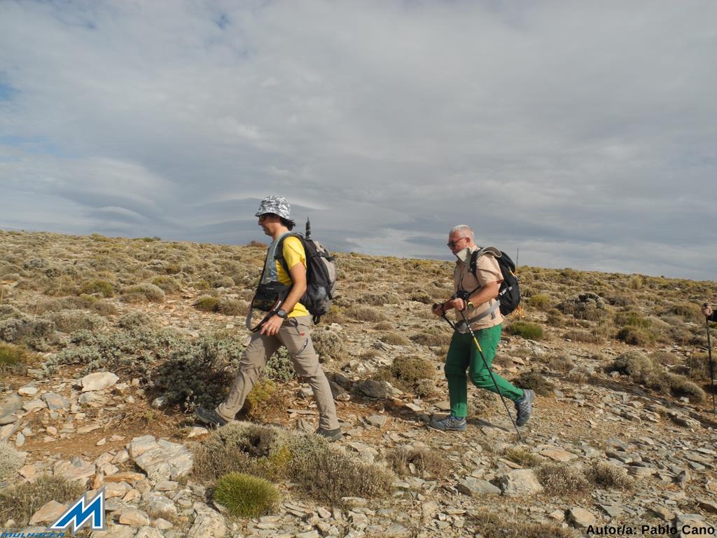 Iniciamos la ruta a las 9’20, tomando el sendero, PR, marcado en las rocas, que, desplazándose hacia la derecha, conduce al vecino pueblo de Lújar, antes coincide un tramo con el “ Cordel de la Fuente de la Higuera”. A las 9’35, obedeciendo al GPS, abandonamos ese rumbo, para encarar, campo a través, la subida del Cordel del Cerro de las Monjas, que conecta, a través de la Cañada Real del Conjuro, con la costa motrileña, y también, hacia arriba, visibles, con las minas de Los Dolores, ya en la Rambla de Lújar. En este primer tramo, Jesús “el Guía” y el Bestiajo ¡marcan el ritmo!, que los demás, callados, seguimos ¡axfisiados! Intentando esquivar el masaje “aulagero”, que junto con tomillos, romeros o espartos conforman este “monte bajo”, otrora cubierto de encinas. Ese ritmo ¡vivo!, sin apenas paradas, favorece que la subida cunda, orientándonos, los que tomamos la cabeza ocasionalmente, por los barrotes negros que señalan la divisoria administrativa (Lagos- Lújar), y el “pastoreo” atento del “Pollúo”. Salvamos varios escarpes rocosos frente al Barranco de las Carigüelas, y ….¡se obra el milagro!, pues, hacia las 11’00 sobrepasamos el Mojón de Lújar ( 1650 mts). Habiendo superado ya el tramo más exigente, disfrutamos brevemente de buenas panorámicas de la Costa motrileña, Salobreña y Almuñécar, hacia el oeste, mientras que del otro lado, separados por el “Cordel” que atraviesa la Sierra de Jaral, -donde se ha instalado un parque eólico -, el malogrado alcornocal renegrido, y en la falda, la pedanía de Don Carlos, atalaya de Castell, Costa de Lújar etc.