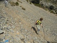 El breve almuerzo transcurre ¡movidillo!, dado que nada ni nadie escapa de las bromas del “Bestiajo”, ….¡Que ha venido refrenándose para no faltar!, dice. El Guía, sin embargo, conforme con el trazado de la ruta elegida hasta aquí, es más indulgente con las “prestaciones” del equipo, al menos, ¡disciplinado! alava. Los postres, ¡ sin chocolate suizo!, carece de swing, así que Jesús “el Pollúo” y el “Bestiajo” ¡encieden motores!. En dirección suroeste, rodeamos la planicie, con la intención de completar un itinerario circular, por un carril ciclable, ( Jesús lo ha subido) que procedente de Órgiva recorre las minas de la zona, y donde medran con fortuna, pinos silvestres de repoblación y buenas manchas del encinar autóctono. Muere el carril terrero junto al Peñón Comerano (1619 mts), pero, lo abandonamos antes, junto a un hito, asomados al Mediterráneo, cuando comienza el Barranco de Lagos, un canchal ¡imposible!,con siete “bocas” movedizas,¡practicable y divertido! según el Guía. Nos convence, el truco consiste en descender con decisión, como si bajaras al trote las escaleras mecánicas del supermercado, pero ¡clavando los talones!. El mismo Jesús, nos hace una demostración del estilo “zancadas de gigante de cuento” y el “bestiajo”, inspirado, de su fórmula ¡eslalon sobre piedras! – hay videos-. La realidad es más de pesadilla, pues, pareces deslizarte por una cinta transportadora, en movimiento perpetuo, repleta de de grava y piedras trampa, que, a veces, se convierten en inesperadas ¡cáscaras de plátano!.