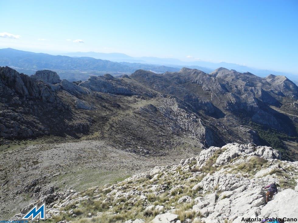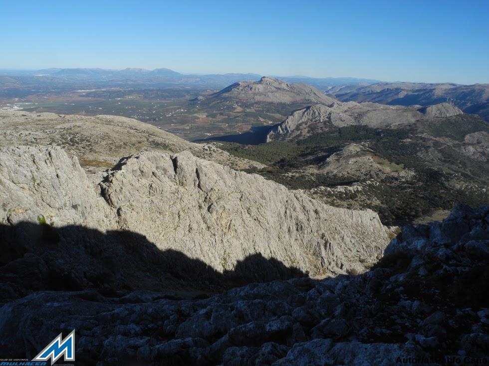 Sobre las 9’20 entramos en el pueblo, y, aunque una señal confusa nos obliga a un callejeo absurdo, no puede con la pericia “albaicinera” de Ana. Por fin, situados en el carril de la Dehesa del Hondonero, subimos hasta el mirador y Alto del Hondonero (1230 mts) donde aparcamos, para comenzar la excursión hacia las 9’50. Con mucho frío (- 3º), vamos rodeando la umbría de la Sierra del Jobo, en dirección sureste, subiendo por la resbaladiza senda, endurecida por la escarcha. Ésta entre arces, espinos (albar) y quejigos (quer.,rotundifolia), remonta, pegada a un vallado, hasta un collado con vistas parciales de Alfarnate. En este punto, giramos hacia el suroeste (derecha) ascendiendo un costrón calizo que deviene en pedregal, que primero nos encarama a una repisa, con espinos albares y atractivas vistas, -(aquí paramos el año anterior.)- subiendo, a continuación a la cuerda, desde la que se divisa, lejano, el vértice del Chamizo (1641 mts). Sin más dilación, iniciamos el “ cresteo” por la aristada caliza, destrozada y agujereada como un queso por la nieve y el hielo, sobre la que, solamente, Ana camina o salta, manteniendo el equilibrio, y ¡ prodigio!, con las manos en los bolsillos. Sobre las 11’30, Ana, seguida por Mara, Cristina y Enrique “trepan” al vértice del Chamizo, y tras la inevitables instantáneas, nos detenemos durante 25 minutos, descansando y disfrutando de las vistas de privilegio de la Axarquía, Sierra Tejeda, Pantano de la Viñuela, Sierra Nevada y Sierras de Málaga. Abajo, “a nuestros pies” se destacan Alfarnate y Alfarnatejo y el peculiar Tajo de Gomer (1229 mts). Sobre las 12’00, comenzamos el descenso siguiendo unos hitos de piedra, que nos van conduciendo hacia la cara sur del pico, y que en zig-zag bajan, en 40 minutos, al Puerto de los Perdigones 1382 mts). Atravesamos, a continuación, en sentido longitudinal, la Sierra de Camorolos/Camarolos por una navazuela alta, aprovechada para el pasto de ovinos, con ejemplares diseminados, pero notables, de espinos albares y quejigos.