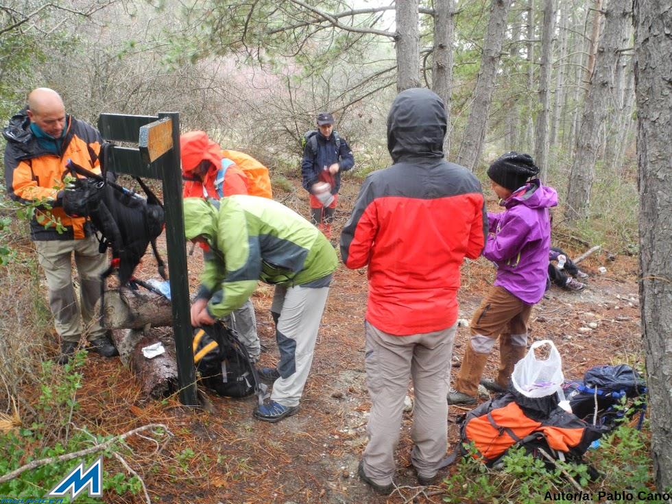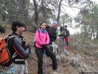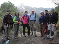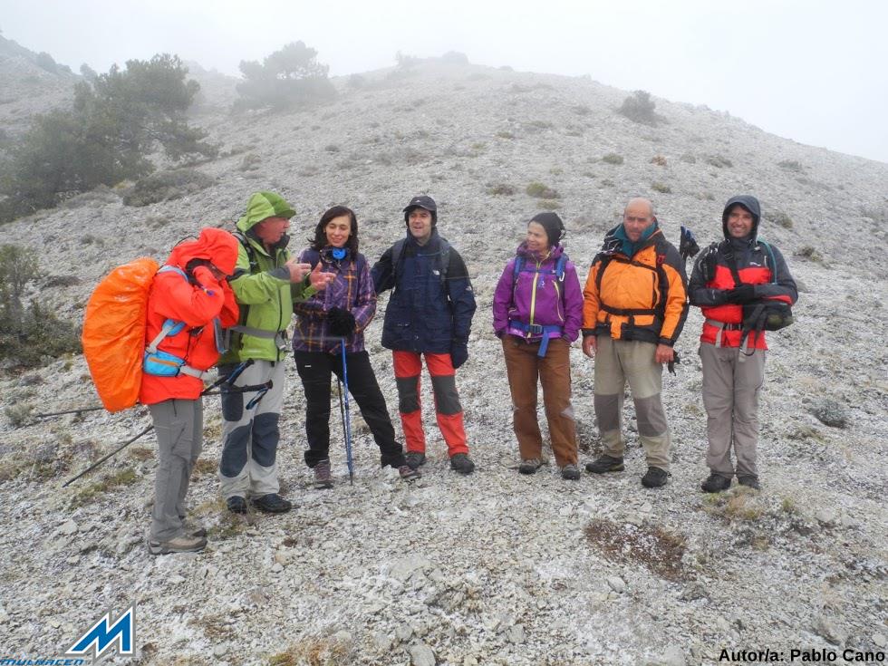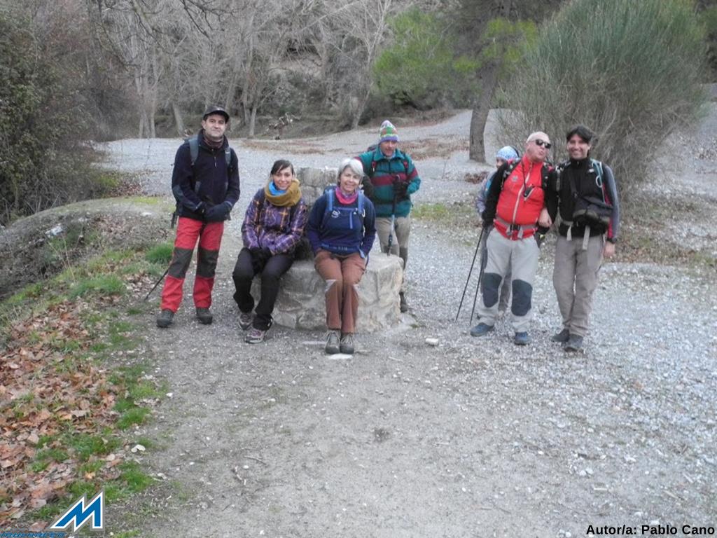 En aquella ocasión, hoyados Picacho Alto y Corazón de la Sandía, iniciamos el regreso. Somos 8: Jesús García, Ana, Belén, Jesús Venegas, Manuel, Conchi, Guillermo “el Bestiajo” y el croniquero, los ¡valientes! mulhaceneros, que, hacia las 8’10, partimos del “Serrallo” en dos vehículos rumbo al Aula de la Naturaleza de “Ermita Vieja de Dílar”, antigüa Casa Forestal de El Toril. Sobre las 8’45 “arrancamos” la excursión desde su populoso aparcamiento, ¡hoy vacío!, por las predicciones meteorológicas. Vamos hacia la Central Eléctrica de Nuestra Señora de las Angustias ( en uso desde 1920), ovbiamos, poco antes, el desvío del Barranco del Higuerón, y, ya en la senda, ignoramos también el puente que cruza a Rambla Seca. Diligentes, seguimos a Jesús, que, gps en mano, vadea el río, cruzándolo en cuatro ocasiones, hasta que localiza, en la ribera opuesta, el camino que buscaba. Es una antigüa vereda forestal semiolvidada, rebautizada “variante del Tito Salva”, que iniciamos sobre las 9’27, y que, “culebreando” alcanza la “oficial”, que asciende por los Atalayones del Río Dílar rumbo a Cerro Hueco. Precisamente, esta larga subida de 50 minutos, es también la más dura, pues supera, hasta el cruce, un desnivel de casi 500 metros, sin apenas descanso. Tomamos, aquí, la vereda ascendente, obviando, respectivamente, la que,por la izquierda viene de los Atalayones, y la de la derecha, que baja a Rambla Seca. Nos conduce, sobre las 10’20, a un singular paraje, ventana hacia el Trevenque (2083 mts) ,que disfrutamos brevemente. Después, girando a derecha, faldea Cerro Hueco (1629 mts), La Cañada de la Selva (1700 mts), El Corazón de la Sandía (1872 mts) y El Picacho Alto (1723 mts), bajando, finalmente, al Cerro de Montellano y Ermita Vieja. Dado que ya ha nevado con intermitencia, el guía “nos convence” para hacer cima tan solo en El Corazón de la Sandía, por lo que, en una pronunciada curva, abandonamos la vereda “forestal”, y subimos a un collado (1723 mts), junto al Barranco de La Rambla de Prado Seco, con vistas de los Puntales del Tigre y Río Dúrcal, donde paramos a almorzar, sobre las 11’22, tras 2’15 horas de marcha. A los postres, mientras algunos ofrecen navideña torta imperial, o chocolate “gourmets”, otros “amenazan” las dentaduras con almendras ¡como piedras!. Sin embargo, nuestra atención se fija en los desollados talones de Belén, que Guillermo El Bestiajo “parchea” ¡con pericia!, gracias a su oportunísimo botiquín de bolsillo. Sobre las 11’46, renaudamos el periplo rumblo al Corazon de La Sandía, con orientación sureste, y, primero por un valle interior que accede a la cuerda que faldea las cimas principales, -deteniéndonos brevemente en un mirador-, continuando después hasta el pie del Corazón de la Sandía. Tras breve trepada, salvo Belén, lastimada, todos subimos por gusto a la afilada cima, atalaya excepcional, en un día despejado, que hoy apenas alcanza a los “montes circundantes”: Trevenque, semioculto,(2083 mts), Cerro Hueco, Picacho Alto (1773 mts), Puntales del Tigre (1769 mts) y Los Gallos (1888 mts) hacia el Río Dúrcal, Castillejo (1979 mts), Tajo Blanco y Pico de la Virgen (1722 mts). Permanece oculta, bajo espeso manto de nubes, la línea de las grandes cumbres. Destrepamos, y, sobre las 12’20, Jesús el Pollúo, con Ana de “lugarteniente”, pone rumbo al Castillejo, bajo una beatífica nevada, que blanquea ,¡al instante!, las laderas de rala vegetación y agudos picos fantasmales. Continuamos hasta el Collado del Pino (1798 mts); extremo de los Alayos, junto al Cerro del Espinar (1884 mts), frente a la Loma de Las Corzas; comienzo de la Loma de Peñamadura. Completadas 4’15 horas, tras inevitable foto grupal, a las 13’15 giramos a la izquierda, bajando al encuentro de la senda de la Cuesta del Pino, donde, el rico bosque mixto de encinas, arces, algún roble, rosales y espinos y pino silvestre repoblado, lucen ya su manto níveo. Llegamos, a las 14’10, al cruce señalizado con flechas de madera, y, mientras “los bestiajos”convencen al “Pollúo” de que la opción para el regreso es faldear Los Alayos, atravesando el Barranco de Juana Benítez, paramos a comer protegidos por el denso bosque, recordando Conchi, entretanto, ¡lo definitivo!, que “¡la senda es muy bonita y va casi a nivel!”. A las 15’30, bajo una copiosa nevada, iniciamos el regreso por la “variante bestiaja”, ¡algo asperilla y pollúa!, pero, eso sí, genuina. Las imágenes del Corazón de la Sandía medio “escondida” entre la niebla; inolvidables. Atravesamos, sobre las 15’00, sin mayor dificultad,pero con precaución, los “quebrados” brazos de aguerrido Barranco de Juana Benítez, -¿ Joaquina Eguarás?- para, tras completar las 6 horas, deternernos en una senda, que ¡en fuerte zig-zag de ascenso! -¿a nivel, verdad?- , aseguran, alcanzará el pie de el Collado de la Selva, y conectará con la senda de bajada. En esta tesitura, los lastimados talones de Belén suplican una tregua, que Guillermo zanja, tras ¡cura clínica!, apretando al máximo los cordones de sus botas. Reiniciamos la marcha, alcanzamos el pie del collado y desembocamos, en efecto, en la senda de Cerro Hueco, que descendemos ¡muy ufanos!, llegando, sobre las 15’25, al primer cruce de veredas matutino. Ahora, tomamos, a la izquierda, la vereda, que entre pinos carrascos nos conduce al barranco de Rambla Seca, blaquísima, bajo la “melódica” nieve.