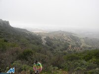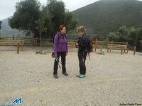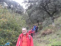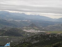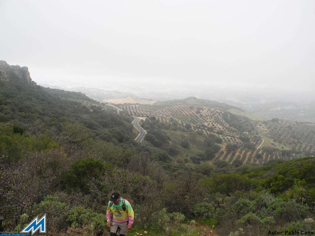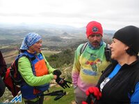 A las 8’00, ya circulamos en convoy por la A-92 rumbo a Sevilla, abandonándola, en la salida de Fuente Piedra, hacia Campillos (Málaga), para desde allí, dirigirnos a Algámitas. Tomamos allí, la comarcal SE.462, en dirección Pruna, para “culebrear” el Puerto Zamorano (750 mts). Detenemos los tres vehículos en un mirador, a 300 mts de la Ermita de ( La Pura y Limpia Inmaculada Concepción) de Pruna. Del primer coche, descienden Teresa, Miguel, Judith (hija de Miguel) y Carmen; del segundo: Manolo, Esther y Conchi; por último, del tercero: Pilar, Ramón, Mara, Kika y el cronista. Comenzamos la excusión, sobre las 10’14, junto al cartel/señal que marca el inicio del sendero al Pico de El Terril (1129 mts), la cima sevillana. Teresa, bajo tutela de Carmen, conduce animada el grupo, ¡muy protestón los primeros metros!, que asciende por el enmarañado encinar, con ¡cierta prevención! Desaparece ésta, sin embargo, minutos después, cuando llegamos a una pradera con un pluviómetro, donde nos reagrupamos. Sobre las 10’35, reanudamos la marcha, tomando el mando de la operación Conchi y Manolo ¡GPS’S en ristre!, seguidos de Miguel y Judith y el resto del grupo. Entre la espesa niebla, vamos subiendo en zig- zag, hasta encaramarnos a una primera loma de la Sierra del Tablón. Le suceden varias lomas más, donde Judith muestra buenos fundamentos “montañeros”. A falta de un mayor reto deportivo, la niebla, que todavía oculta la cima, mantiene la incertidumbre de su ubicación visual, mientras transitamos ahora, por un sendero (PR) - (blanco/verde) – marcado en piedras y rocas. Finalmente, sobre las 11’35, cuando las brumas se disipan, nos encontramos encima de un collado frente a la máxima elevación de la breve serranía, rematada por un vértice geodésico. ¡Seguro qué es El Terril! Judith, sin esperar al reagrupamiento, baja con presteza el collado, para subir rauda, y en 15 minutos, coronar el pico destacada. Otra avanzadilla llegamos de inmediato, y dando tiempo al resto del grupo, disfrutamos mientras tanto de las “vistas de pájaro” sobre los pueblos de la falda serrana. Hacia el noreste, bajo el Peñón, el sevillano Algámitas, por donde hemos venido; Pruna y Olvera, gaditanos, aparecen hacia el suroeste, por donde regresaremos. Sobre las 12’00, ya hemos celebrado con Teresa y Carmen esta segunda efeméride y repetido posado en el vértice geodésico, por lo que el dios Eolo, ¡harto! nos expulsa del dominio sin contemplaciones. Descendemos al collado, donde, protegidos, brindamos con cava y comemos frugalmente, acomodados junto a unos troncos secos. Reanudamos la marcha -12’50- tomando el sendero PR-marcado con piedras, que transitando por el “espejismo de los palmitos” y patrullado por los buitres, da vistas a Pruna y Olvera. Faldeando la sierra en dirección suroeste, permite completar un recorrido casi circular, que finaliza en la pradera con pluviómetro, que utilizamos como referencia esta mañana. Son las 13’40, y solo resta bajar al mirador, pero, recordando la dificultad del acceso matutino, decidimos seguir la senda que traíamos, que reaparece tras la somera praderilla. ¡Diana! Desciende, cómodamente, entre un precioso encinar, que crestea un contrafuerte calizo, señalando el límite de la Sierra del Tablón. Salimos ¡contentísimos! Frente a los vehículos. A continuación, tras visitar La Ermita, viajamos de Pruna a Olvera por la A.-363, donde, además de celebrar el “tercer tiempo”, Carmen entrega, a los participantes, la ¡“cartilla oficial”! Techos de Andalucía, con las dos primeras cimas selladas. ¡ Qué orgullo e ilusión! Bonales, El Chullo, El Torreón, La Maroma, Mágina y El Mulhacén aún esperan, ¡ANIMAOS!