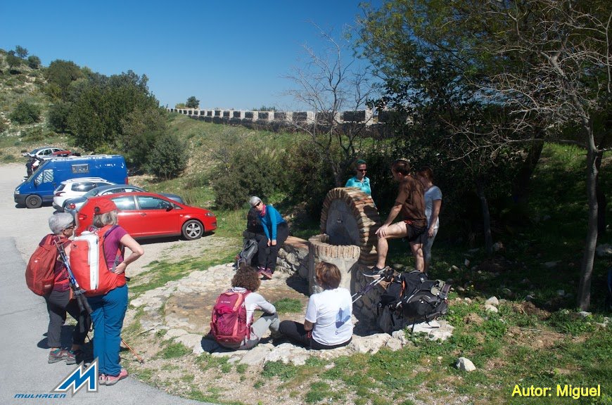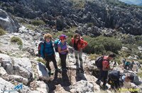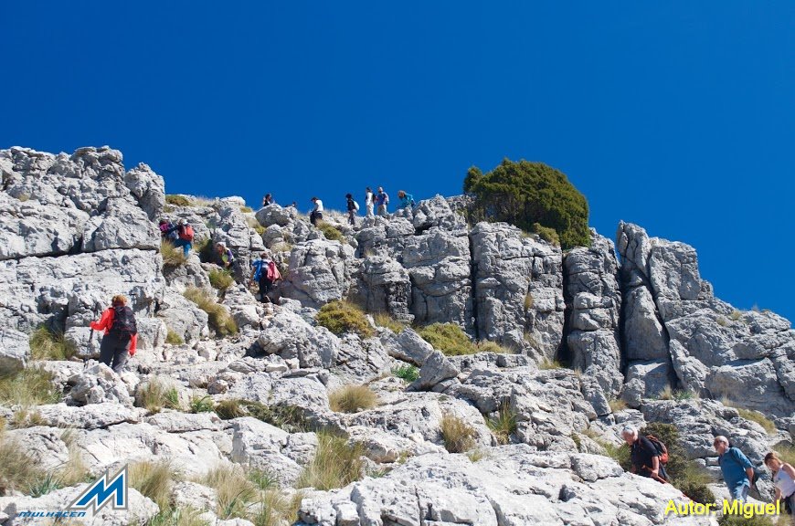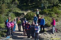 Foto de salida y preparación para la subida que nos esperaba. Una mañana inusual en cuanto a temperatura, ni invernal, ni primaveral, casi veraniega . Suerte que el sendero asciende entre pinos, palmitos, algarrobos y algún que otro pinsapo; a trechos parecía el bosque encantando con escalones para piernas largas .