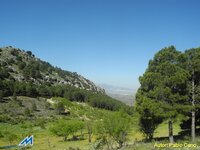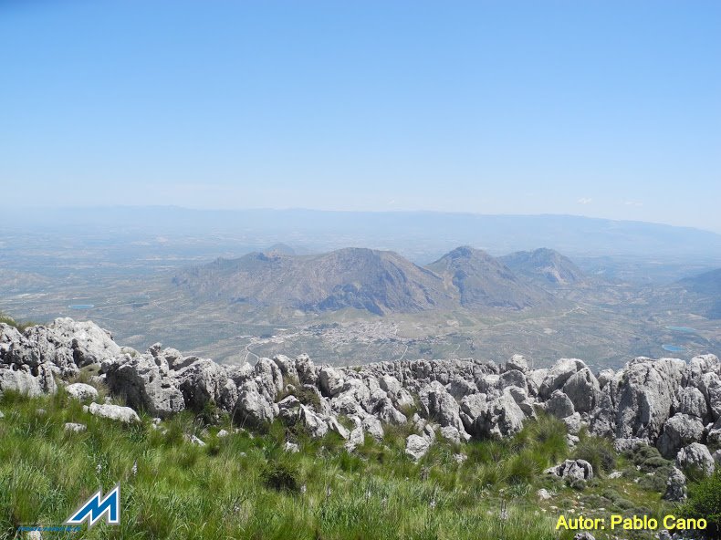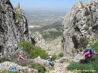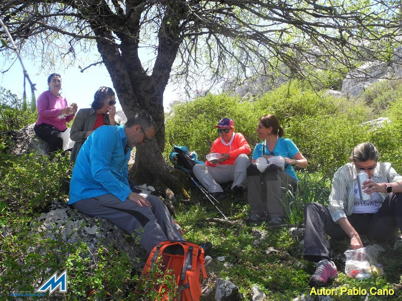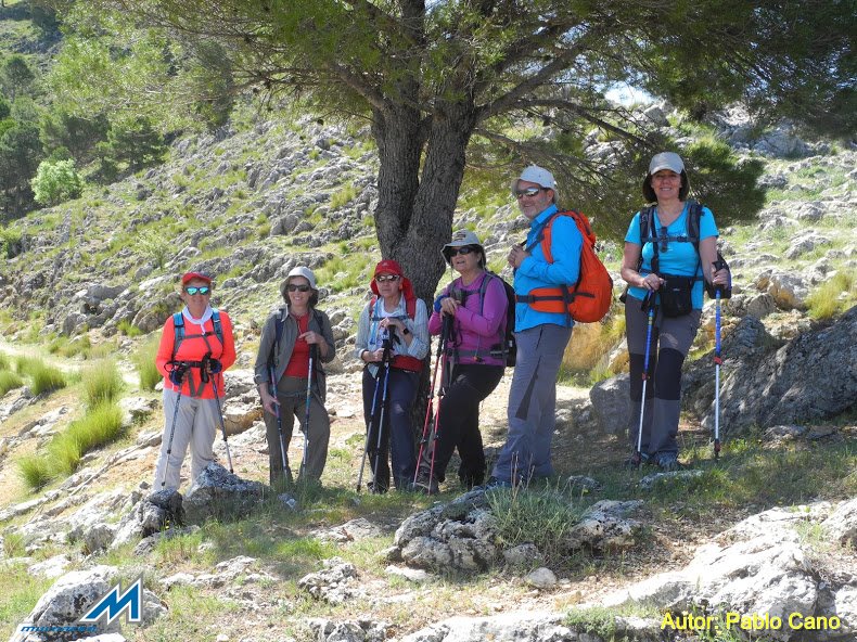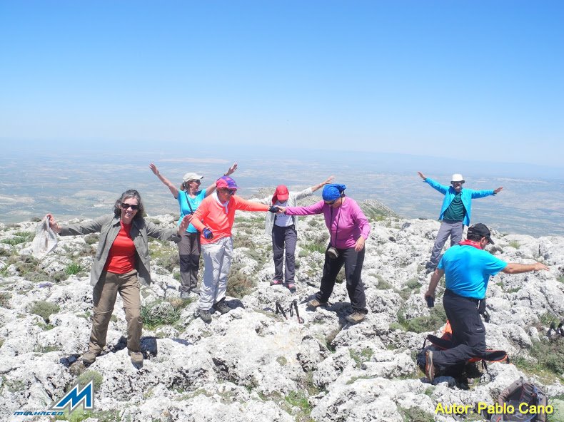 de Mágina en un día primaveral. Partimos de Granada a las 8’30 en un convoy de dos vehículos compuesto por Cecilio, Mara, Pilar, Ramón, Kika, Ana Quintana, Maite y el cronista, que ya estuvimos el año anterior. Entramos al Parque Natural de Sierra Mágina (1989) en la Sierra Subbética jienense por el ¡Jerte andaluz!, el pintoresco pueblo de Torres, procedentes de Mancha Real. Subimos la carreterilla (JA. 3107) al Puerto de Albanchez (1250 mts), -obviando el desvío al Manantial y Área Recreativa de Fuenmayor-, donde sobre las 10’20 aparcamos ¡Menudos domingueros! “Echamos a andar” por un carril,( VP) el Cordel de Guadahortuna, con rumbo oeste, entre fincas de cerezos y almendros, sobrepasando, sucesivamente, el Cerro Castellar, el Cerro de la Vieja y la Hoya Alta, rodeando las crestas calizas de “los aznaitines”, que quedan a nuestra derecha. Sobre las 11’15, el camino “entra” en el pinar de carrascos girando a la derecha, llegando en breve al Cerrillo Tesoro (1391mts), con vistas al olivar infinito de la campiña y del pico Almadén (2036 mts), donde nos reagrupamos. Reiniciamos la marcha, y, diez minutos después, tomamos la senda que atraviesa el pinar entreverado de Arces, Quejigos y Encinas que “reivindican” su espacio “usurpado”. Cuando ésta se extingue, tras un singular escarpe rocoso, aprovechamos la circunstancia para oficiar ¡el útimo brunch! que nos ayudará en el ascenso a los picos. Proseguimos, conduce Ramón, que, ¡como las cabras! Nos hace “trepar” por un canuto ¡mágico! que nos encarama a un colladillo que da acceso a las cumbres. El Aznaitín de Jimena queda hacia el noroeste, por contra, nosotros nos dirigimos hacia los otros dos; el Aznaitín que ostenta el vértice geodésico (1745 mts), en primer término, y el Aznaitín de Albanchez (1741 mts), que asoma por detrás. Cruzamos la planicie de lapiaz, medio hundida, pues antes fue sima,-Ana dixit- donde el sol castiga tanto que obliga a Ramón a “atacar” los picos sin dilación, abordándolos por su flanco izquierdo. Subimos al collado que separa a ambos “visitando” en primer lugar El Aznaitín, propiamente dicho, atalaya de excepción de las cimas de Mágina, pueblos del Guadalquivir y sierras del sur. Tras fotos y ¡danzas imposibles! en el “gruyere” calizo descendemos, entre hondas dolinas, hasta el collado, y avanzando un poco hoyamos el Aznaitín de Albanchez, conocido popularmente como Pico del Águila, del que, ya con hambre, “huimos” para buscar una sombra donde comer. Entre las 14’45 y 15’20, bajo el parasol salvífico de dos espinos hermanados oficiamos el almuerzo. Sobre las 15’25, iniciamos el regreso entre los dos picos, pegados al precipicio, con vistas aéreas de Albanchez de Mágina y Bedmar. Conforme descendemos, se va dibujando un senderillo en el margen izquierdo del pedregoso barranco, que cruzamos casi al final. Salimos por una senda cabrera, -donde “destellan” las calcitas cristalizadas- a la vía que subimos al comienzo de la jornada. Bajando a los coches Mara y Cecilio proponen visitar la afamada Cascada del Zurreón y el Manantial y fuente de Fuenmayor antes del “tercer tiempo”, por lo que bajamos el puerto hacia Torres. Poco antes de llegar al núcleo urbano, tomamos, a la izquierda, la carretera que pasando antes por la Zona de Acampada de Hondacabras y el Área Recreativa de Fuenmayor nos conduce a la susodicha cascada ¡hoy chorrerilla!. “Desandamos” la pista de 6 kms hasta el área recreativa, donde nos refrescamos en su fuente “monumental” con albercón, para buscar, seguidamente, un hotel rural, donde agradecemos con unos brindis a los organizadores la magnífica jornada acontecida en este vergel escondido a las faldas del Almadén.