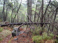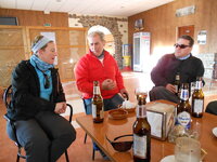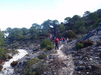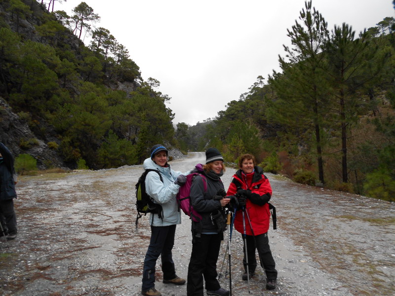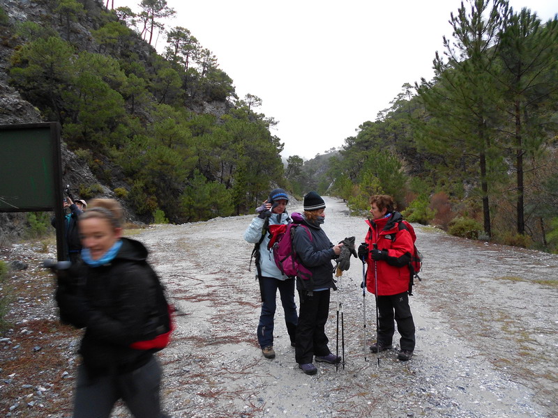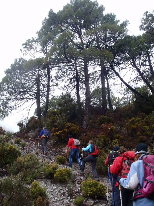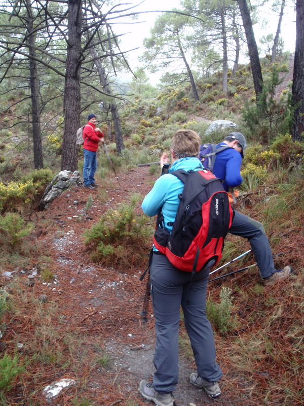Tomamos la primera vereda que va aumentando su inclinación y el silencio de sus andarines y poco a poco se llega al cortafuegos. Allí empieza el viento. Gorros, guantes,bufandas, corta vientos... toda clase de capas de ropa de las mochilas van saliendo como si se tratara de la chistera de un mago." Parecía que no llevabas nada en esa mochililla y mira todo lo que ha salido".